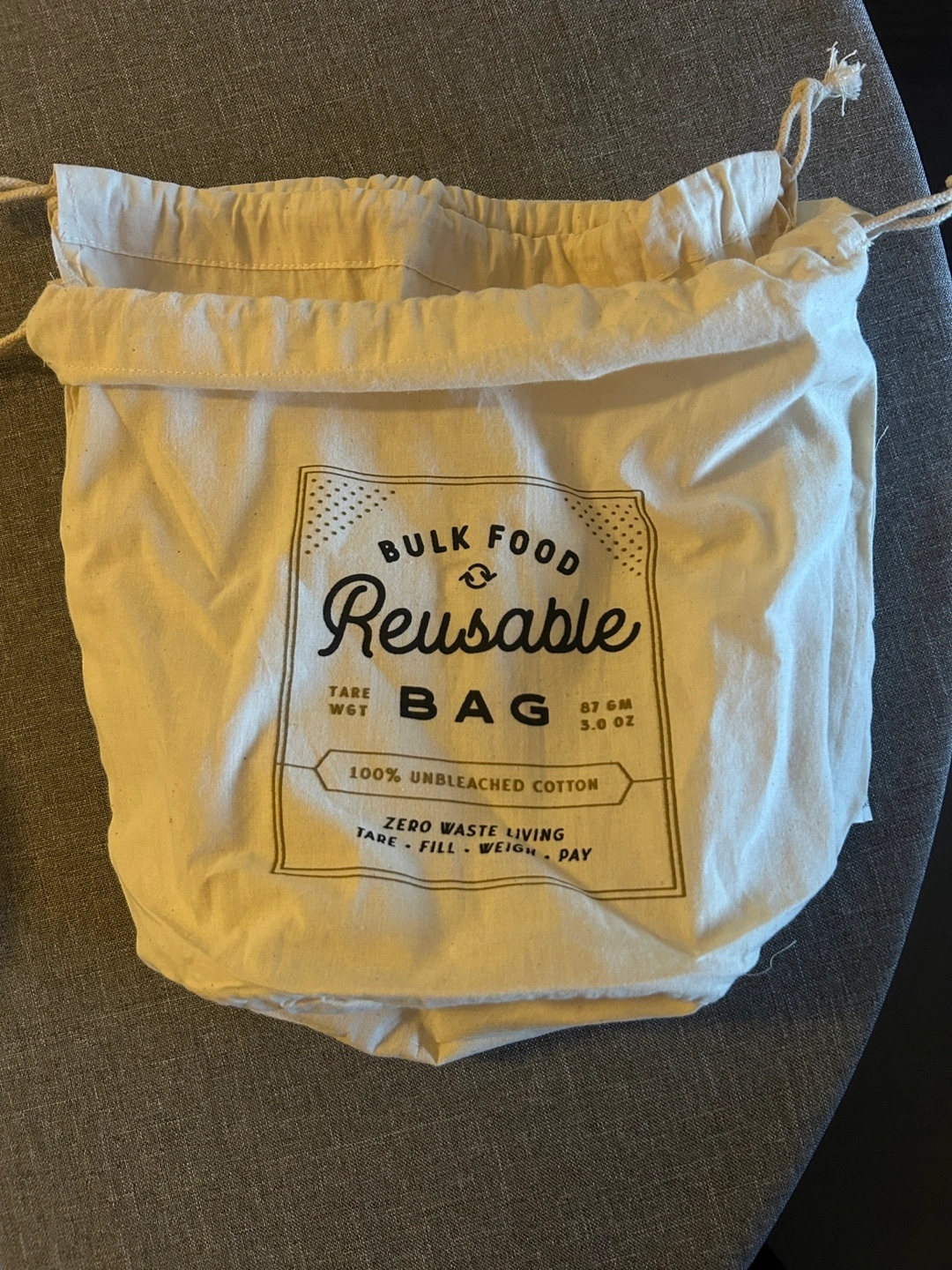 100% unbleached cotton reusable bag. Tare weight 87 g / 3 oz. Perfect for bulk food shopping. Zero waste living.