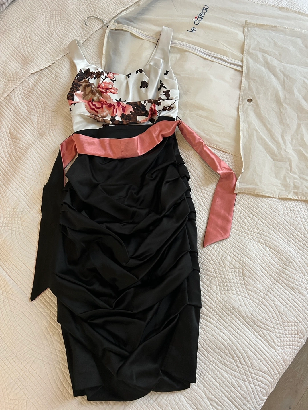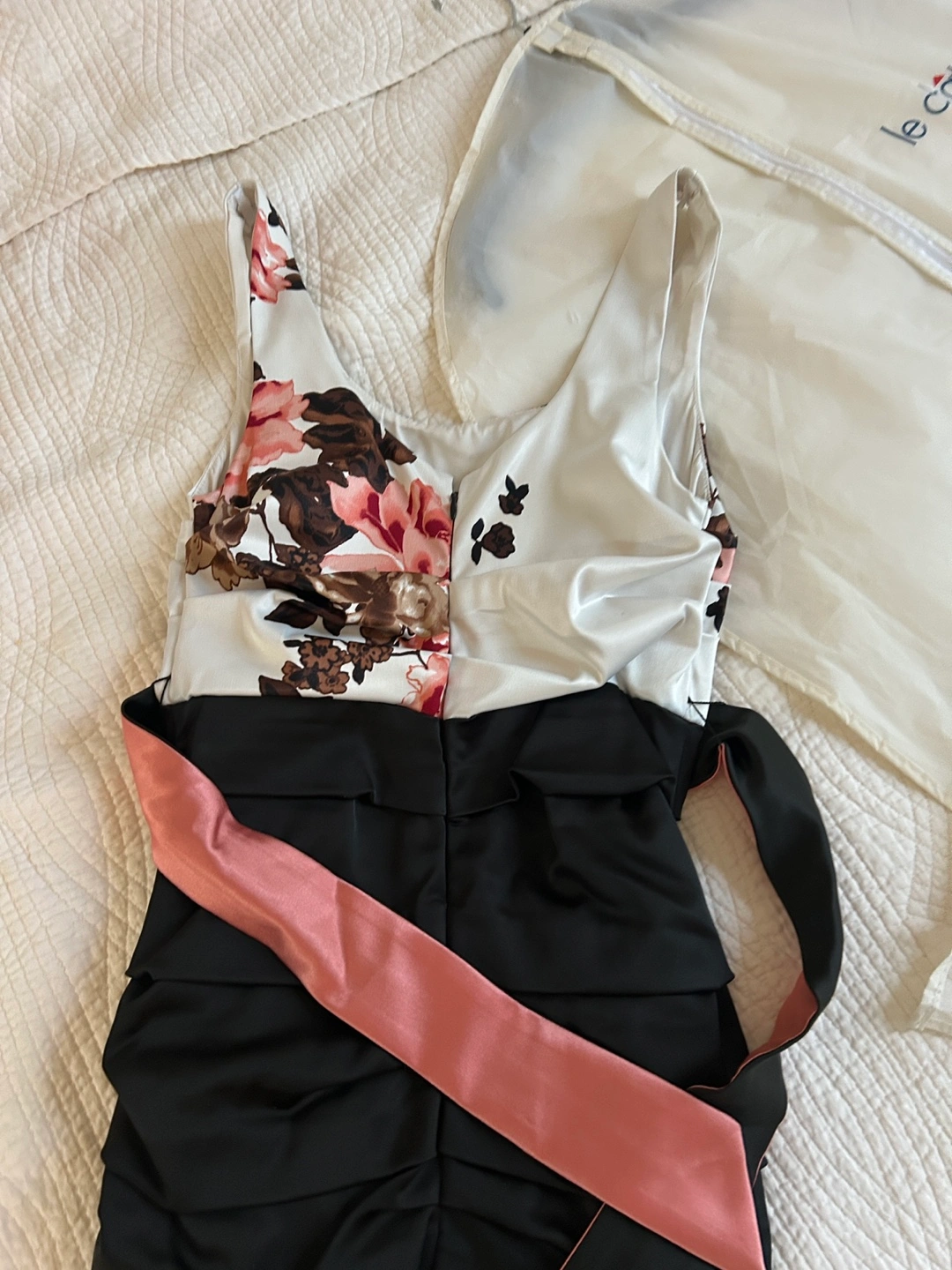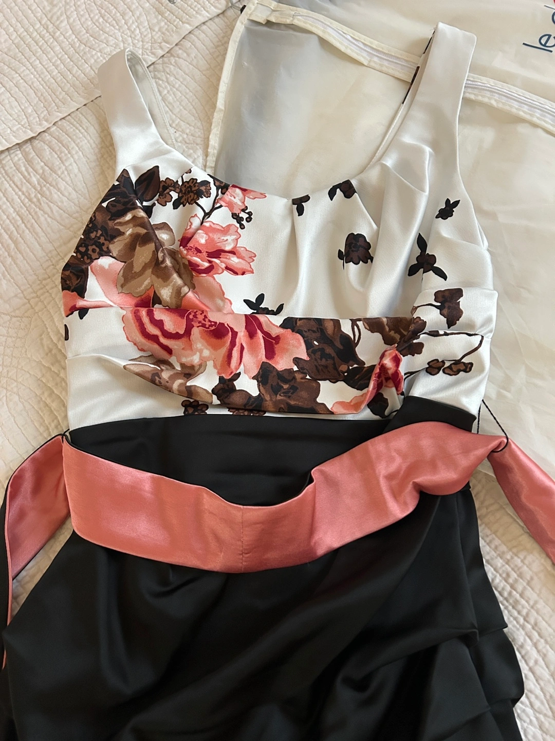 Stunning dress with a floral bodice and ruched black skirt. Includes a removable dusty rose and black sash. Size small. Made in Canada!