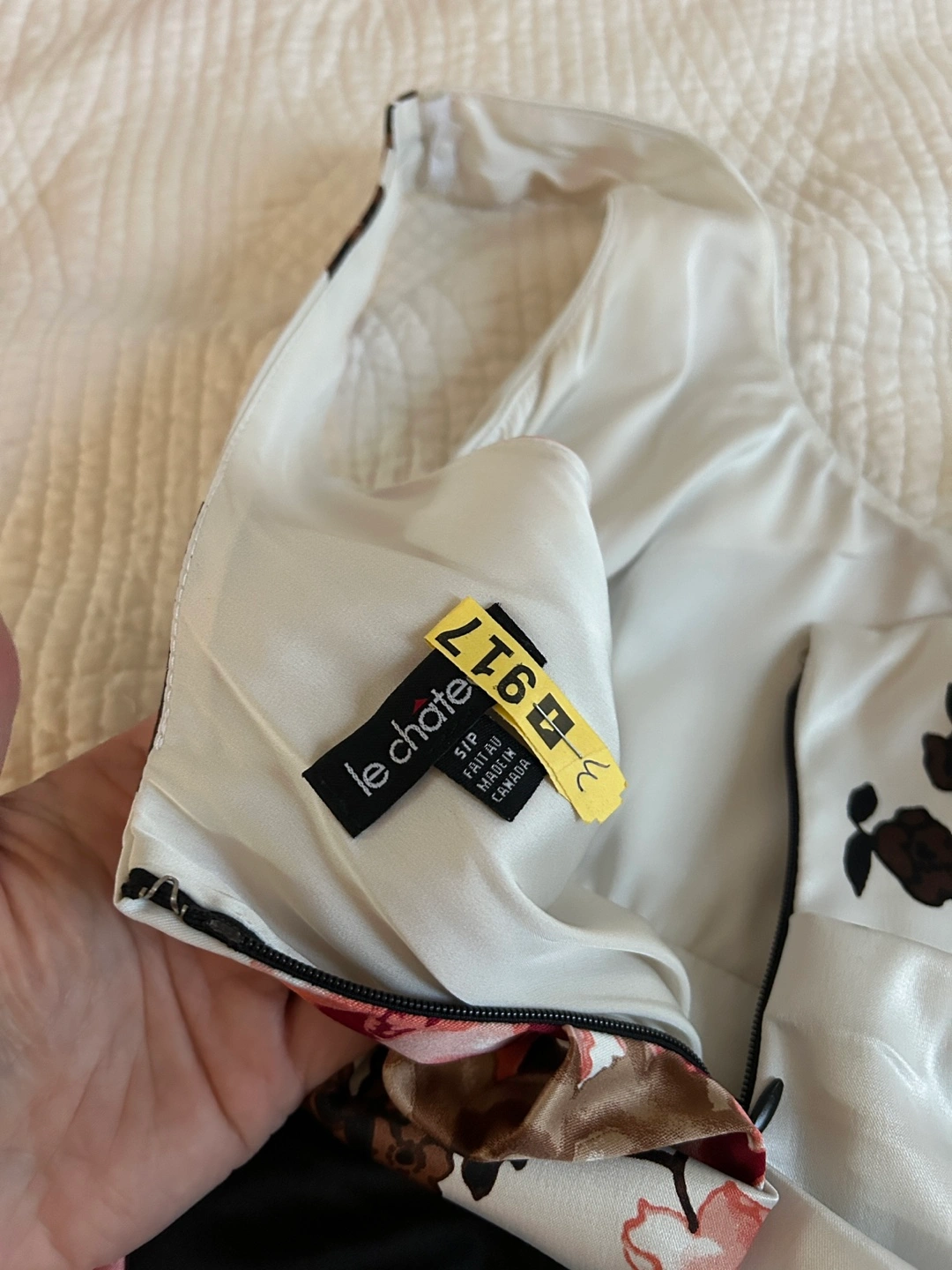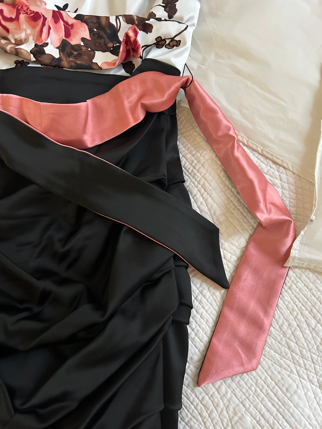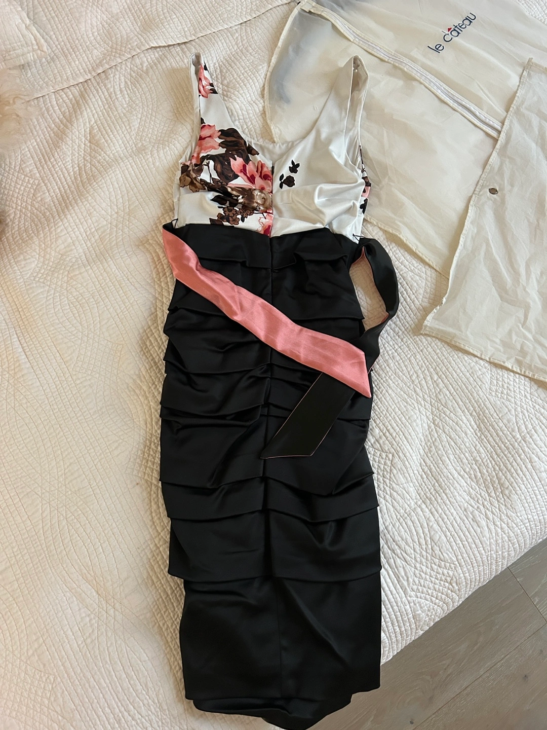 Stunning dress with a floral bodice and ruched black skirt. Includes a removable dusty rose and black sash. Size small. Made in Canada!