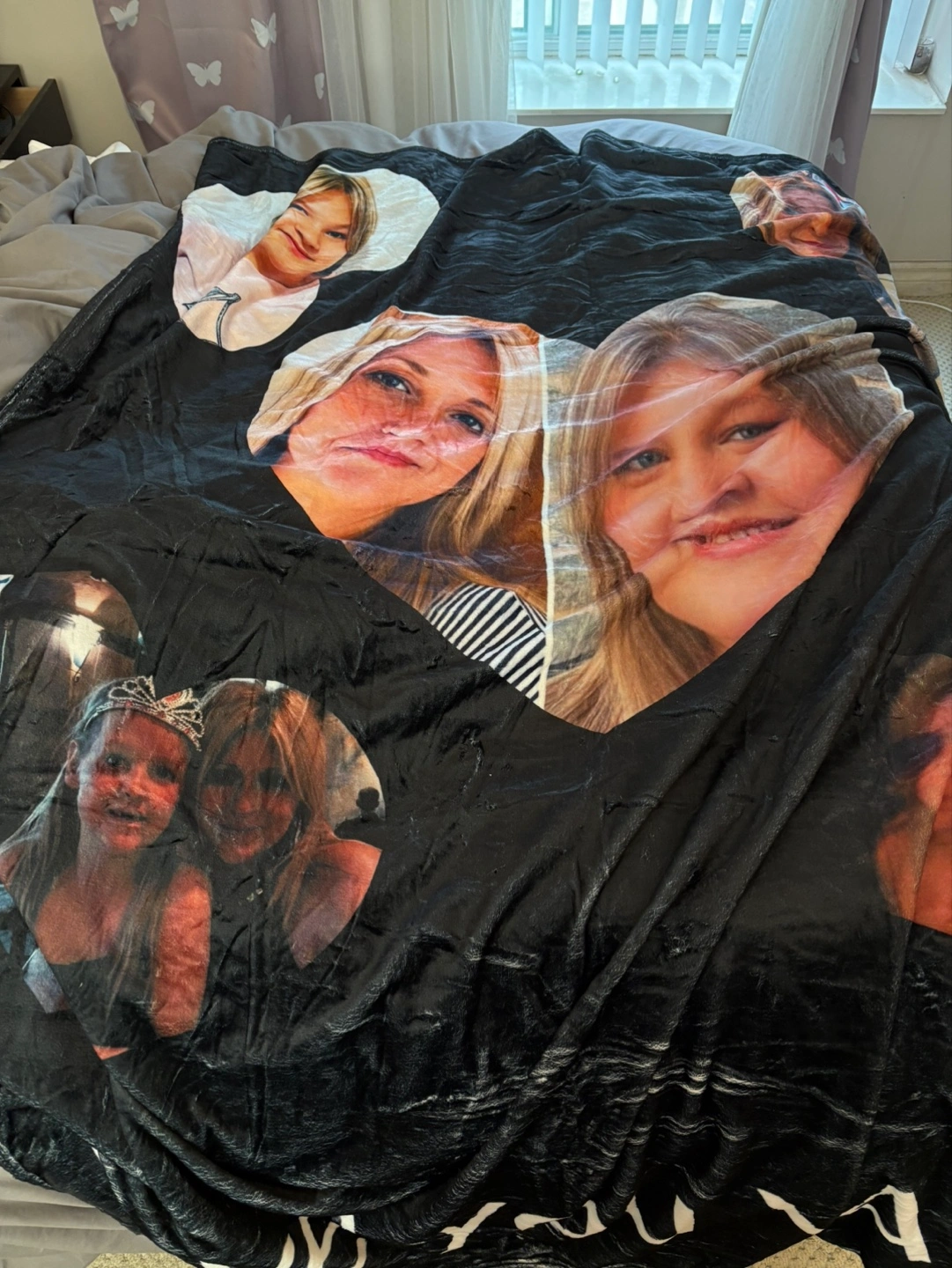 936Soft fleece blanket. Features several photos printed on a black background. New Twin size