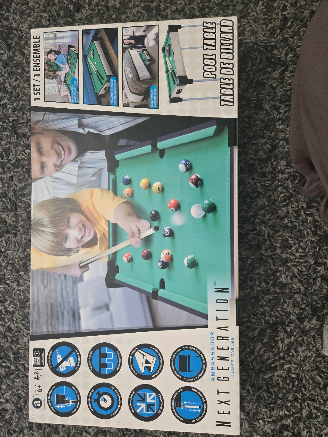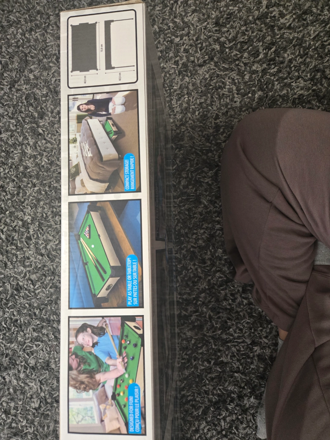 136New in box. Compact pool table. Easy storage. Includes balls and cues. Great for kids.