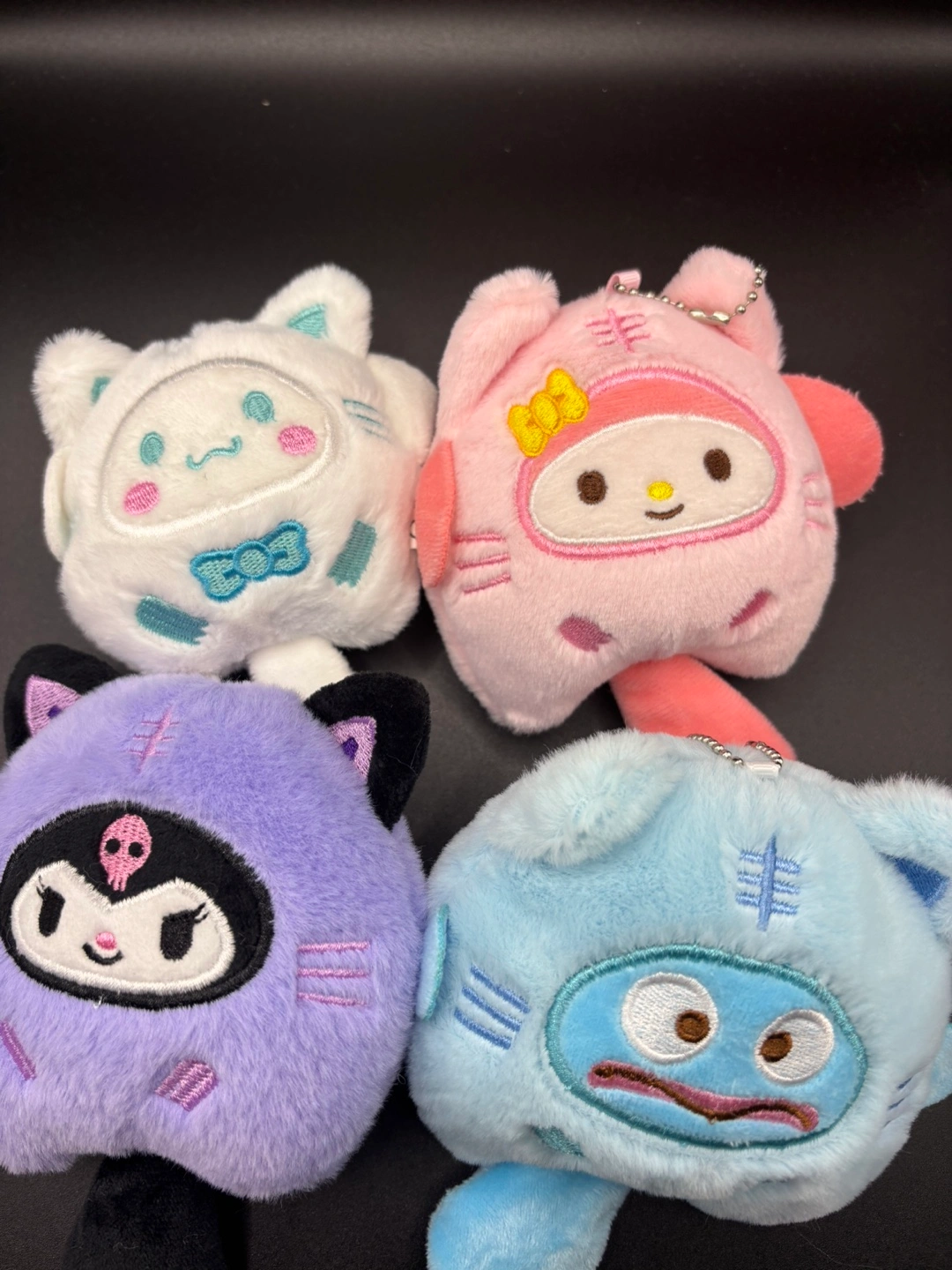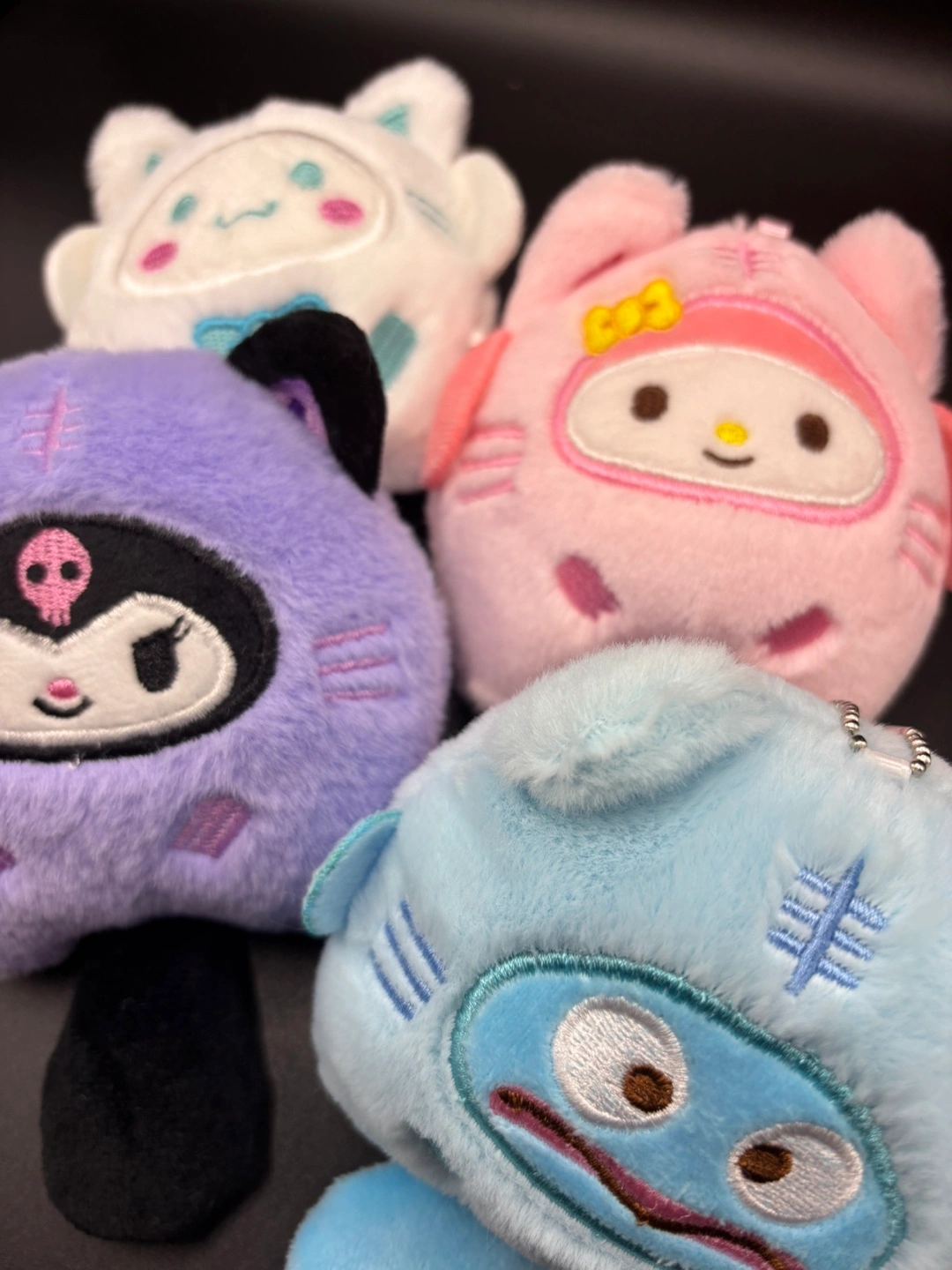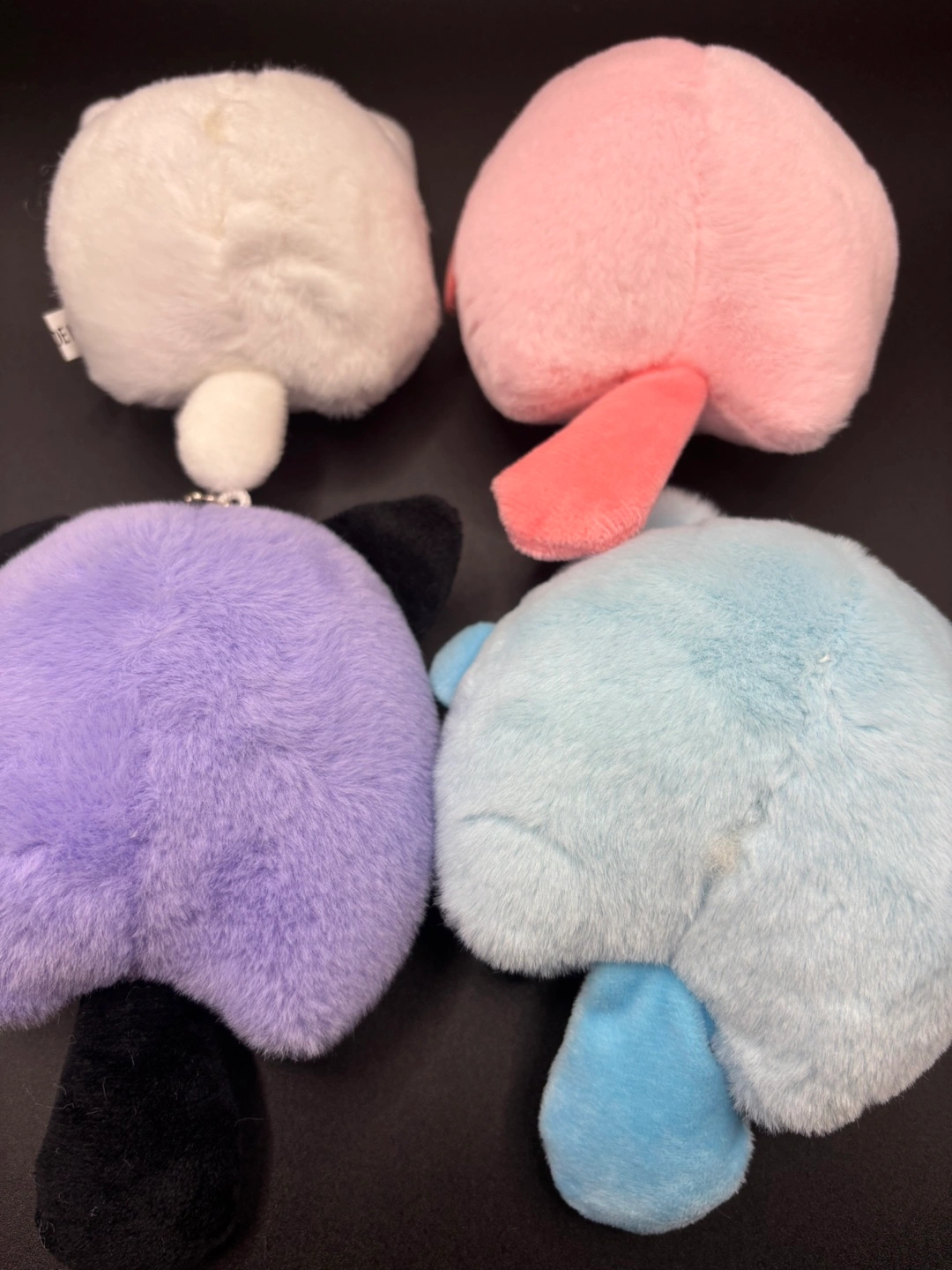 fluffy keychains featuring cute character designs. Soft plush material. Small size, perfect for bags or keys. Collectible items.