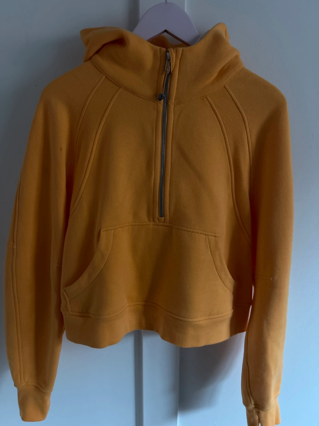 Mango colored cropped hoodie. Half zip. Kangaroo pocket. Lululemon logo. Size medium/large.