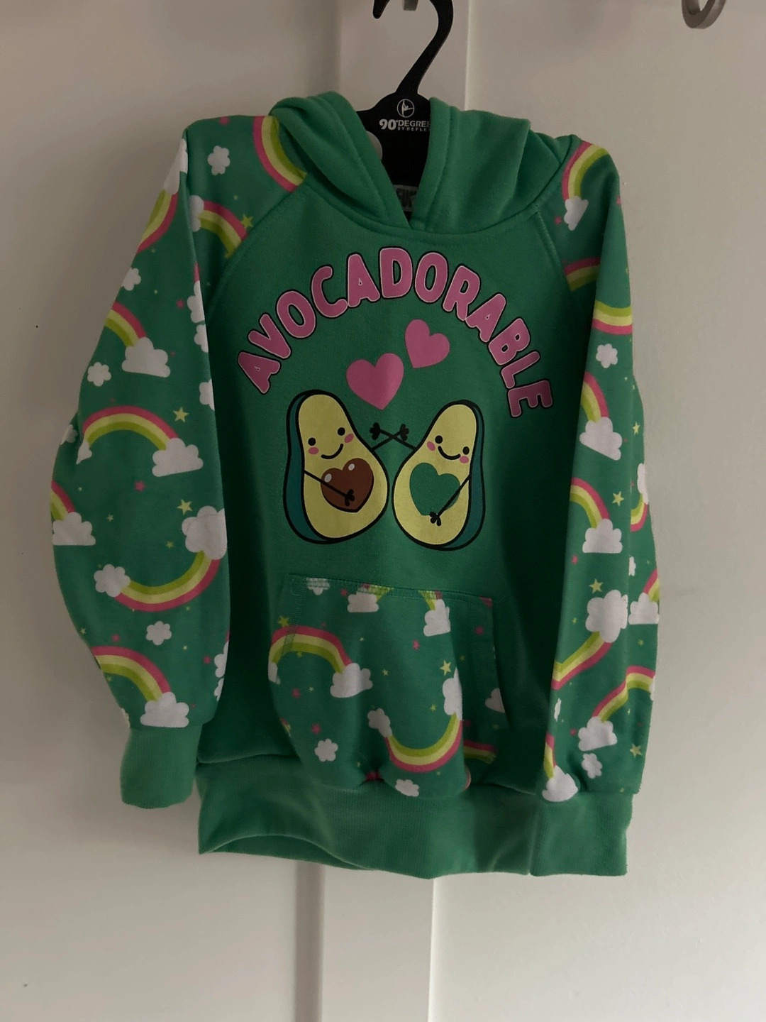 Adorable green kids' hoodie. Features an avocado design on the front and back. Rainbow and cloud accents. Size XS/TP.