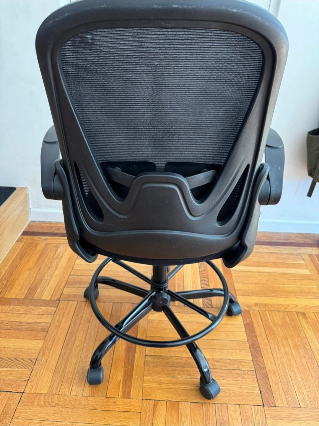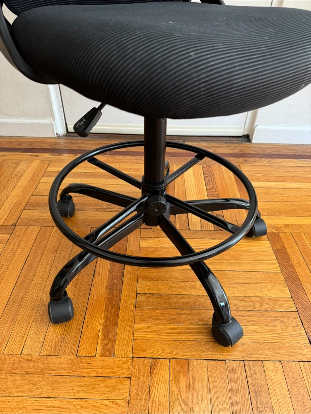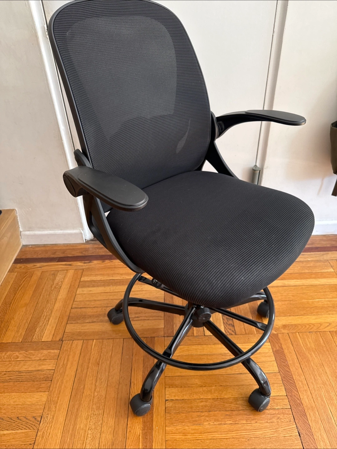 Comfortable black mesh drafting chair. Features adjustable height and rolling base, foot rest, lumbar support. Perfect for home office or studio.
