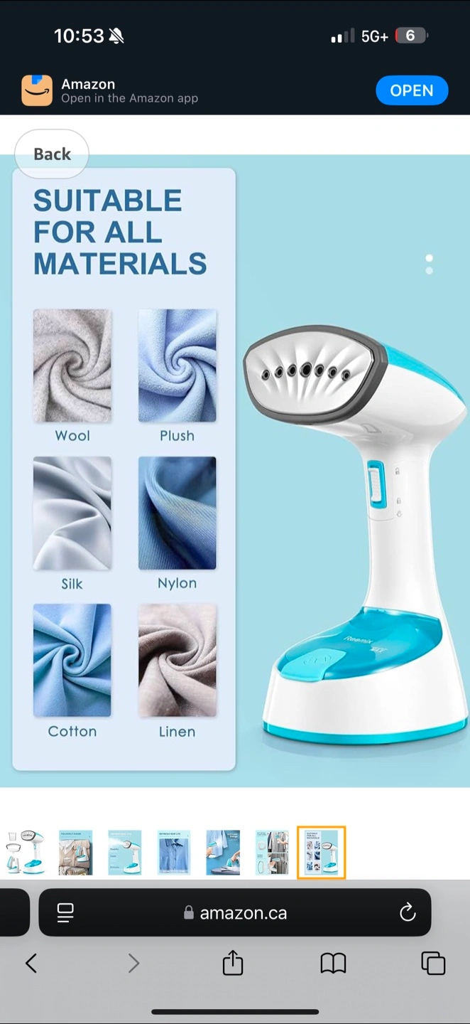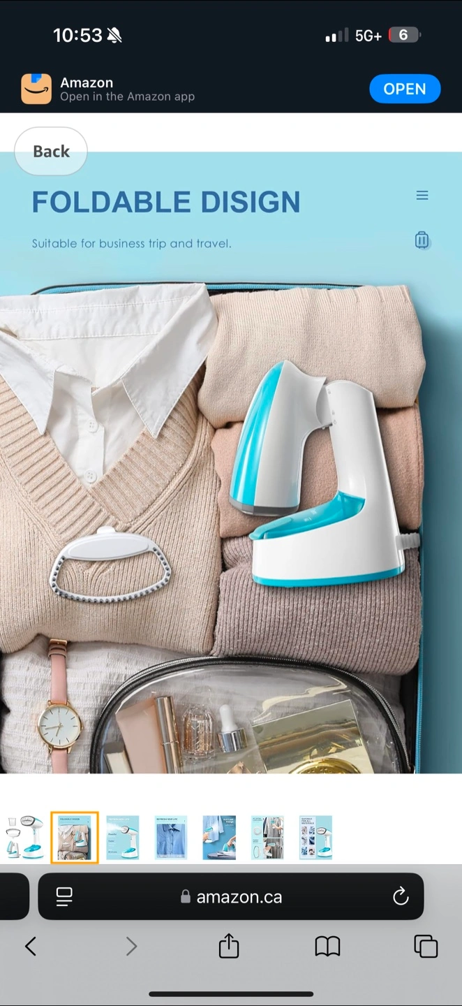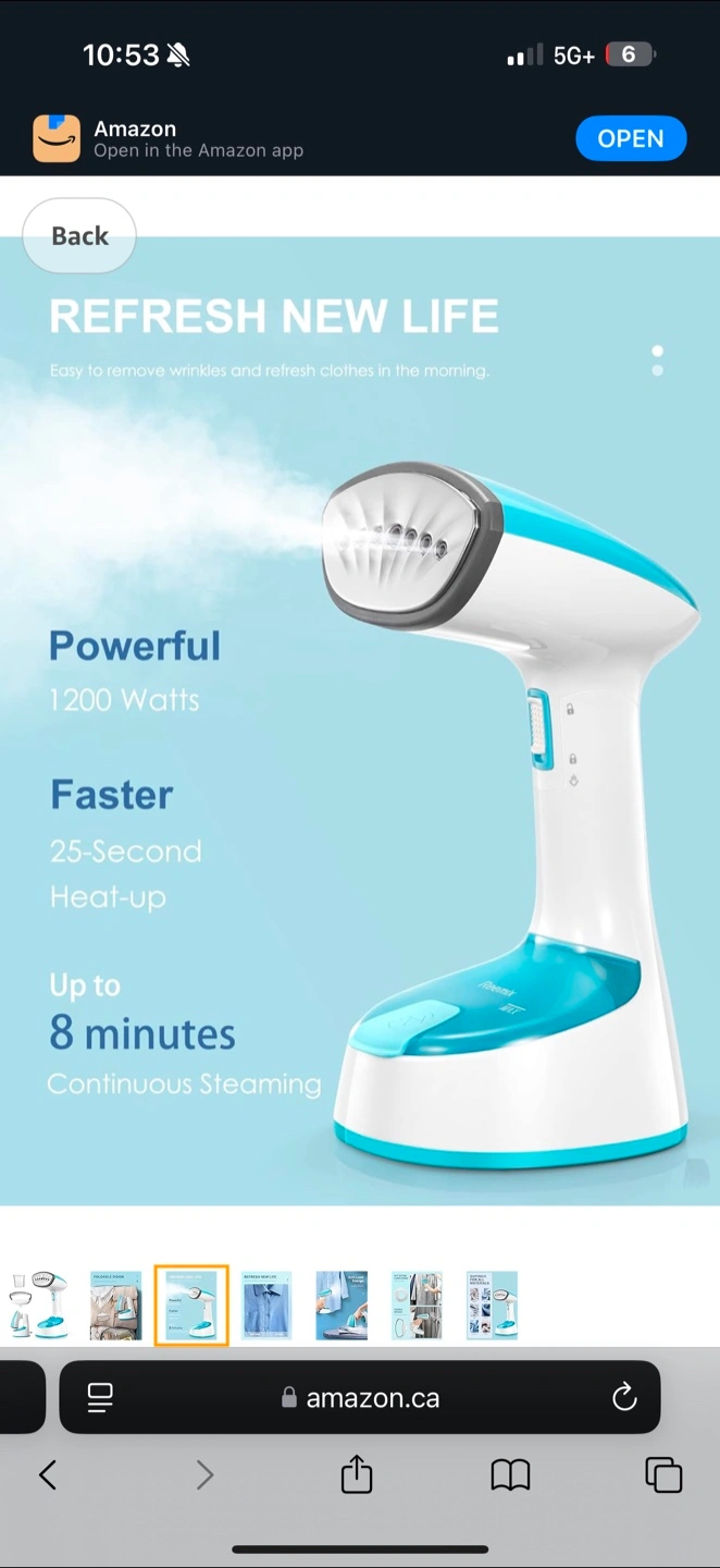 Powerful handheld garment steamer. Features 1200 watts, 25-second heat-up, and up to 8 minutes of continuous steaming. Anti-leak design. Vertical and horizontal steaming. Foldable for travel. Includes attachments.
