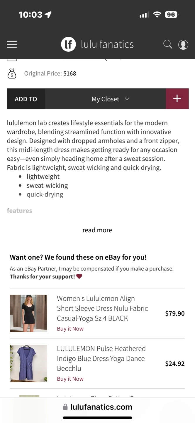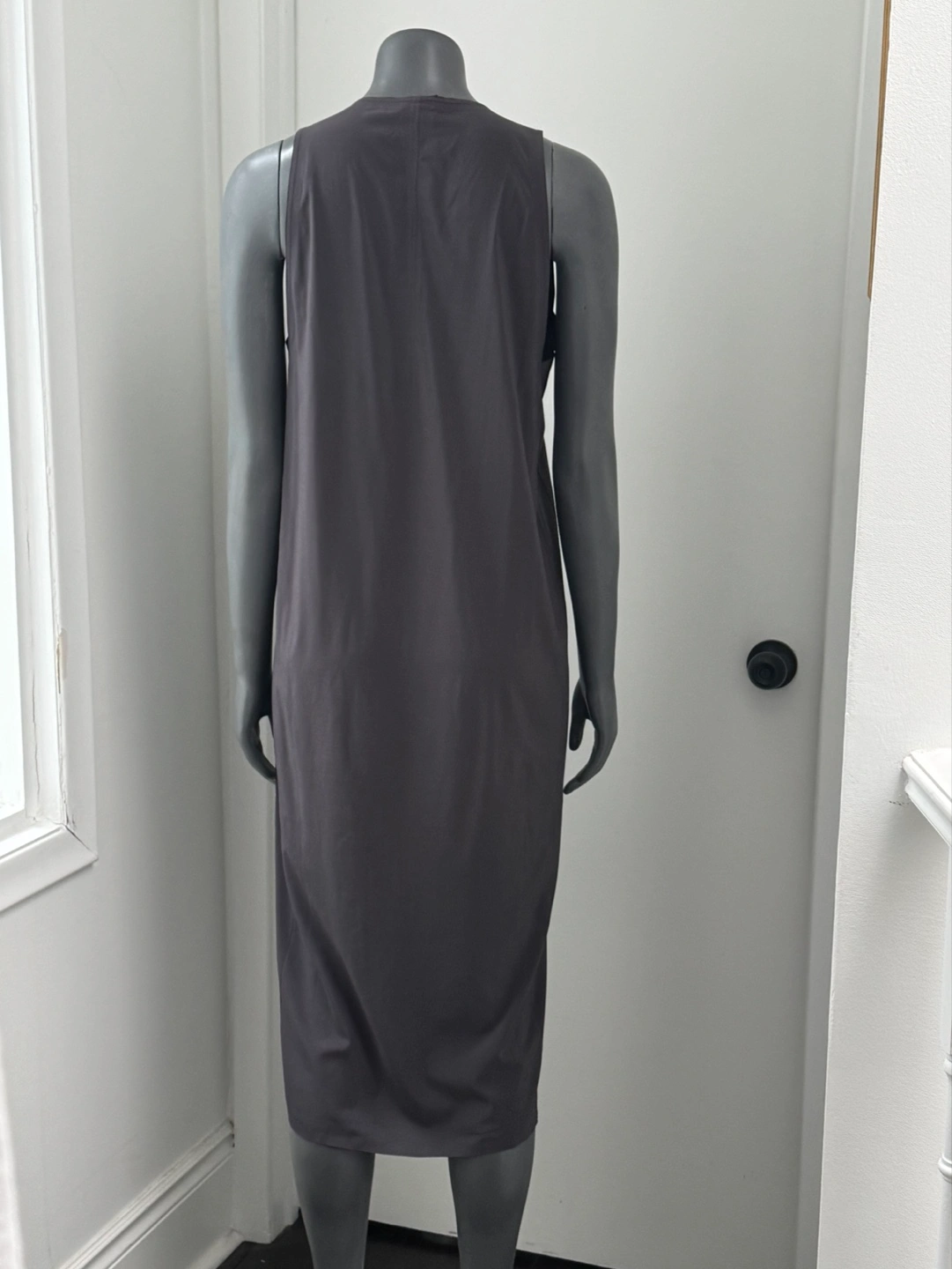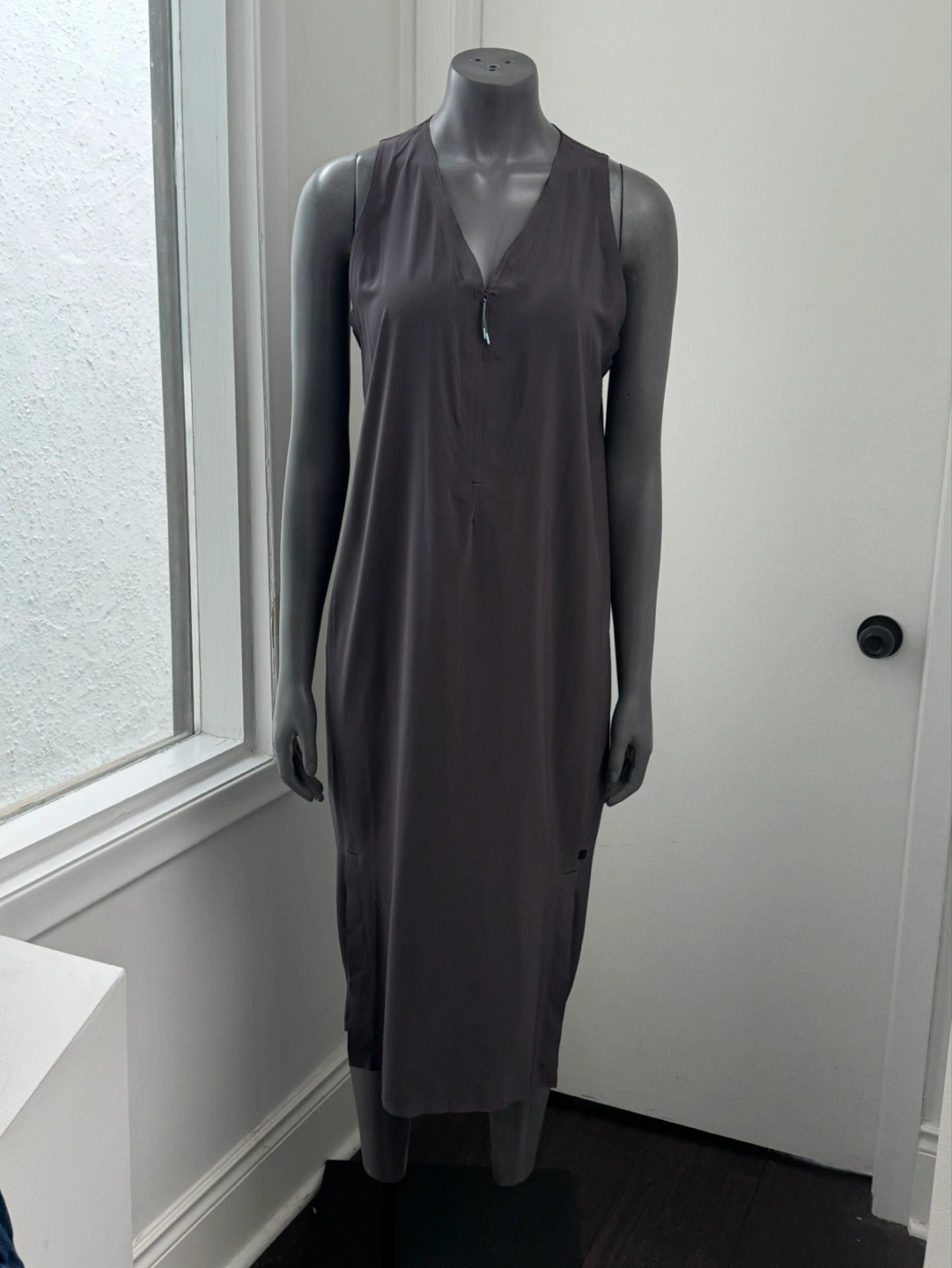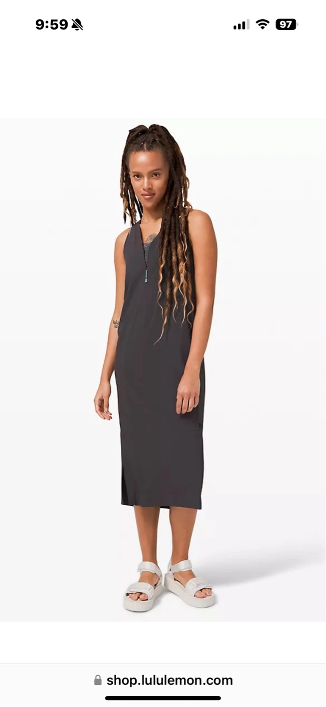 Midi-length sleeveless Sarala dress. Features a front zipper and side slits. Lightweight, sweat-wicking, and quick-drying fabric. Perfect for workouts or casual wear. Paid 168+hst. Never worn NWOT