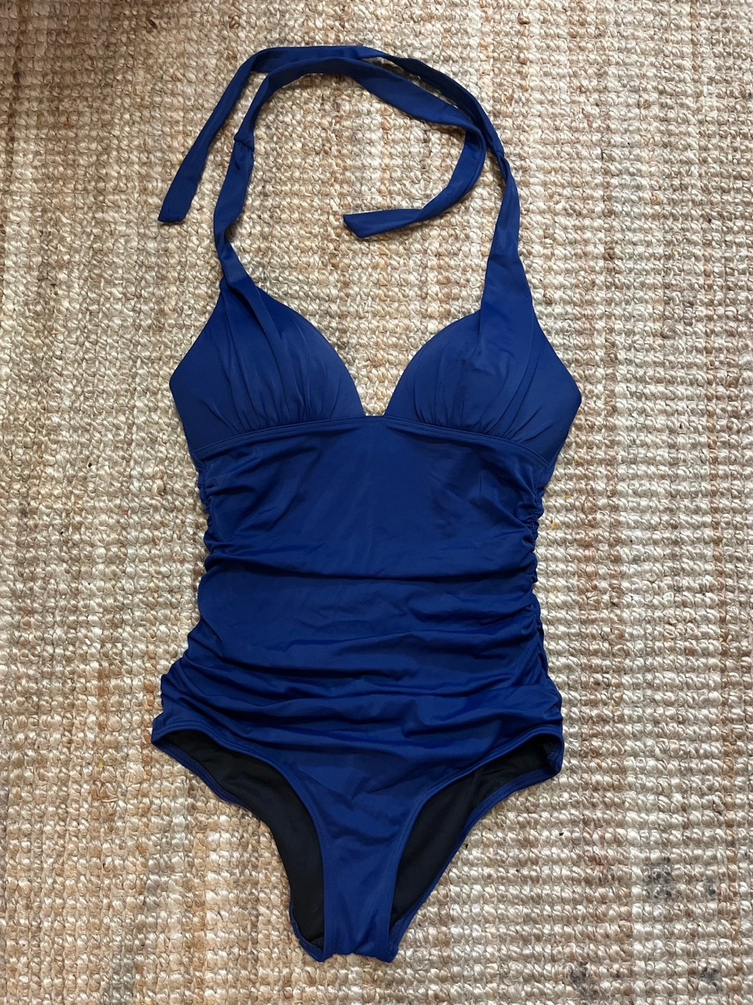 Stunning navy blue one-piece swimsuit. Halter neck style. Excellent condition. Size small.