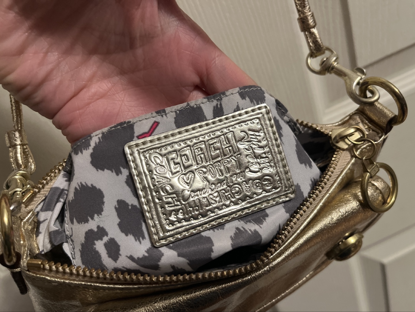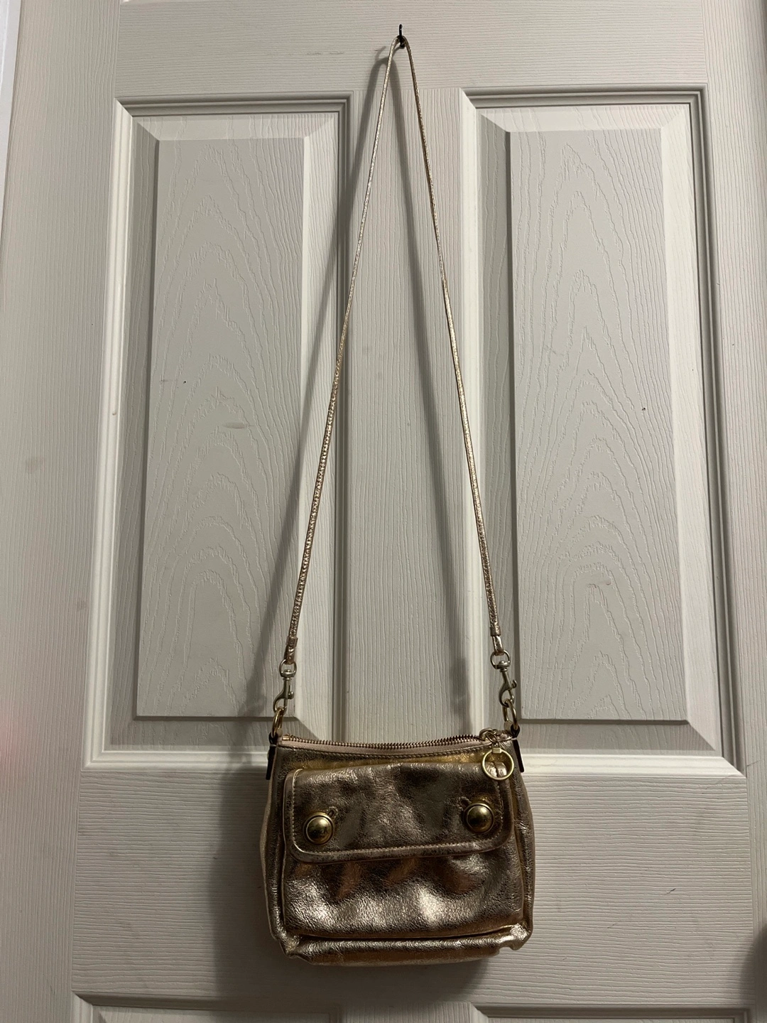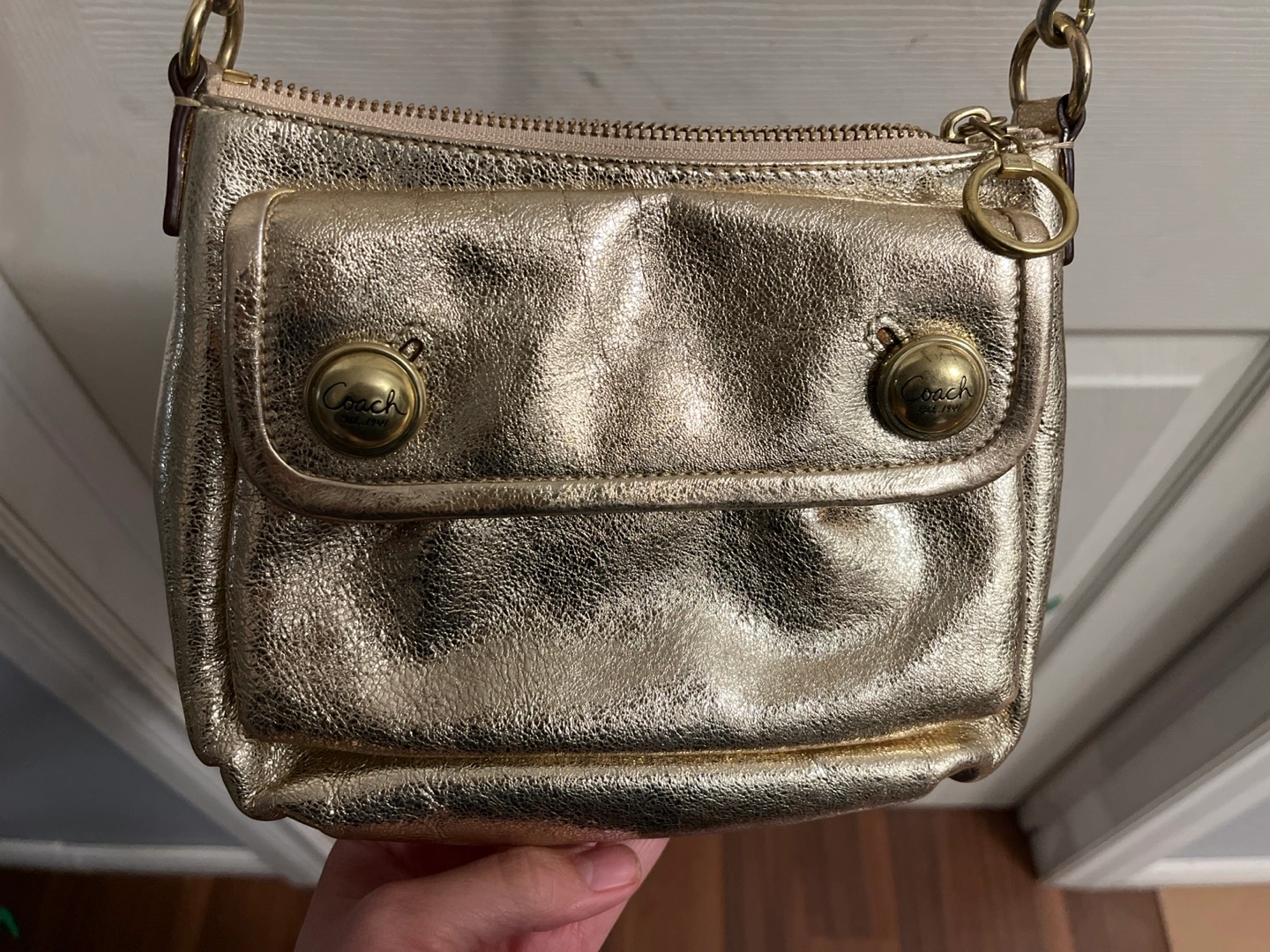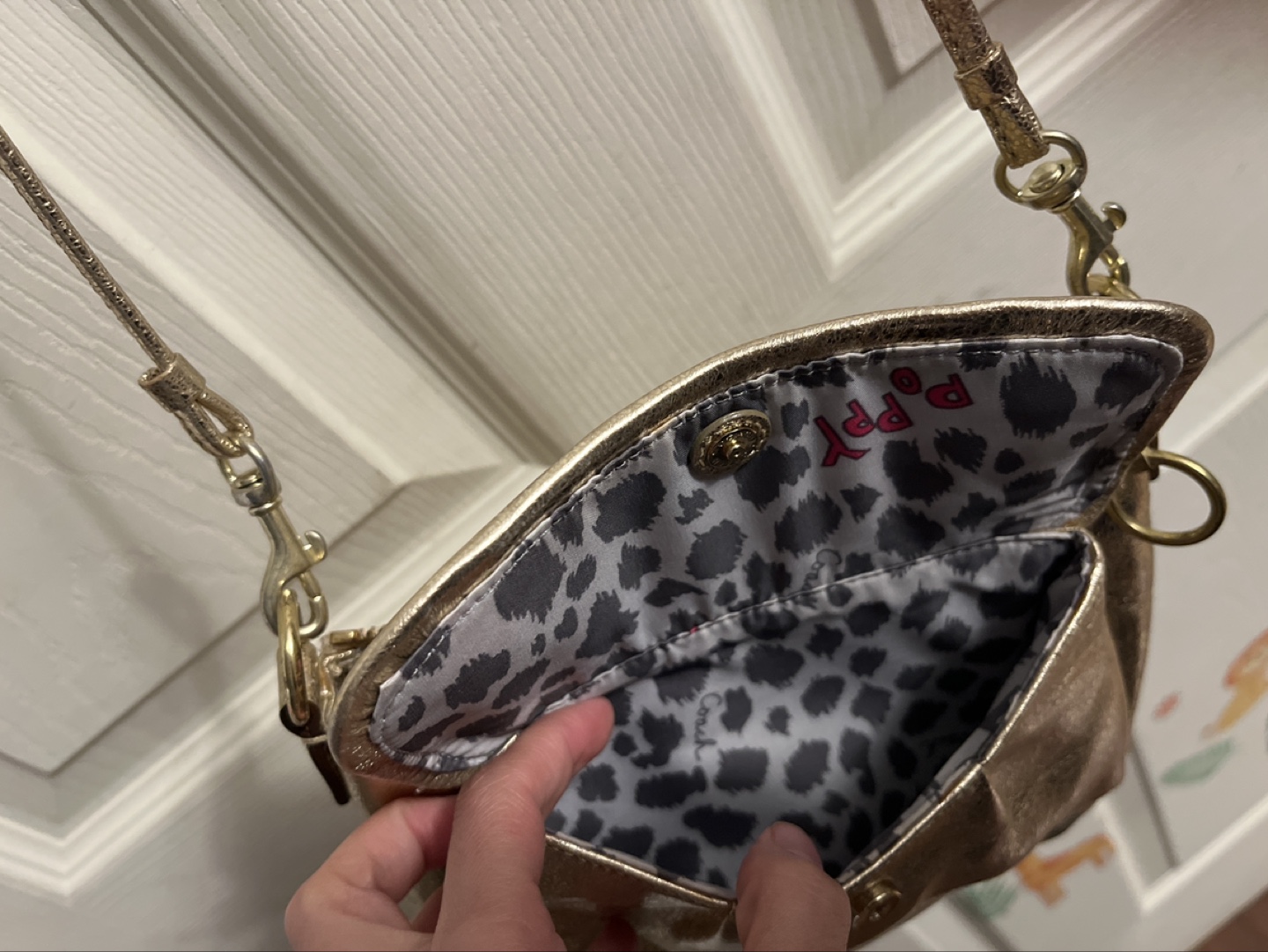 Small gold crossbody bag. Features a zipper closure and adjustable strap. Interior lining with leopard print. Excellent condition.