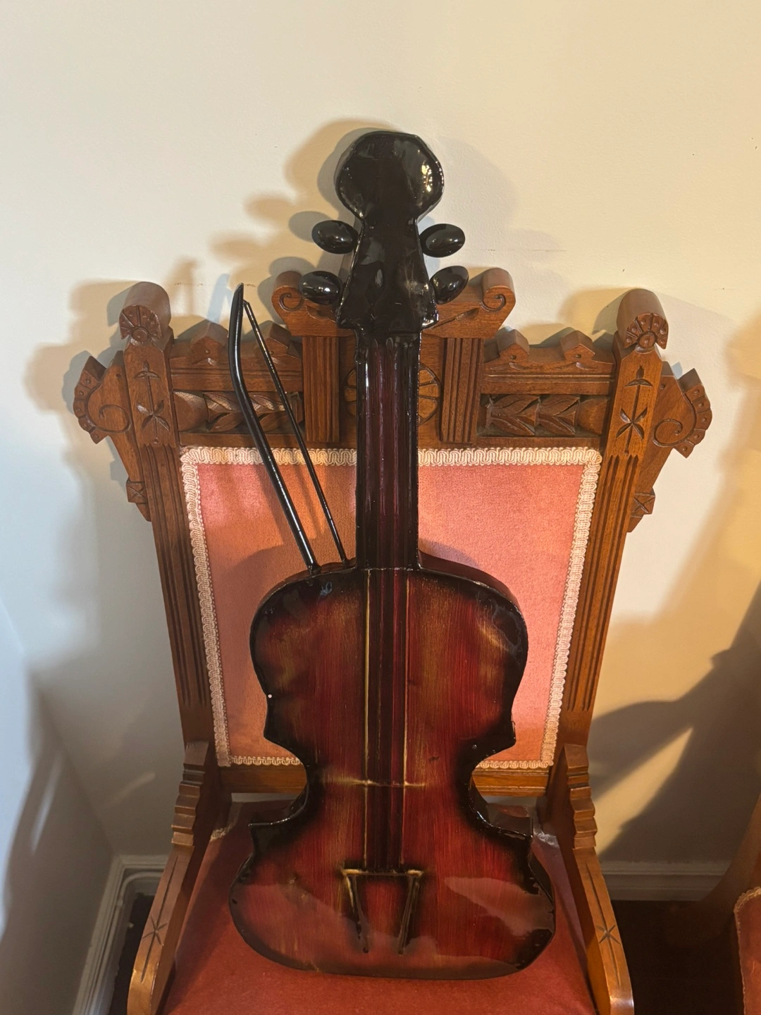 Unique metal violin wall art. Dark reddish-brown finish. Includes bow. Great addition to any music lover's home.