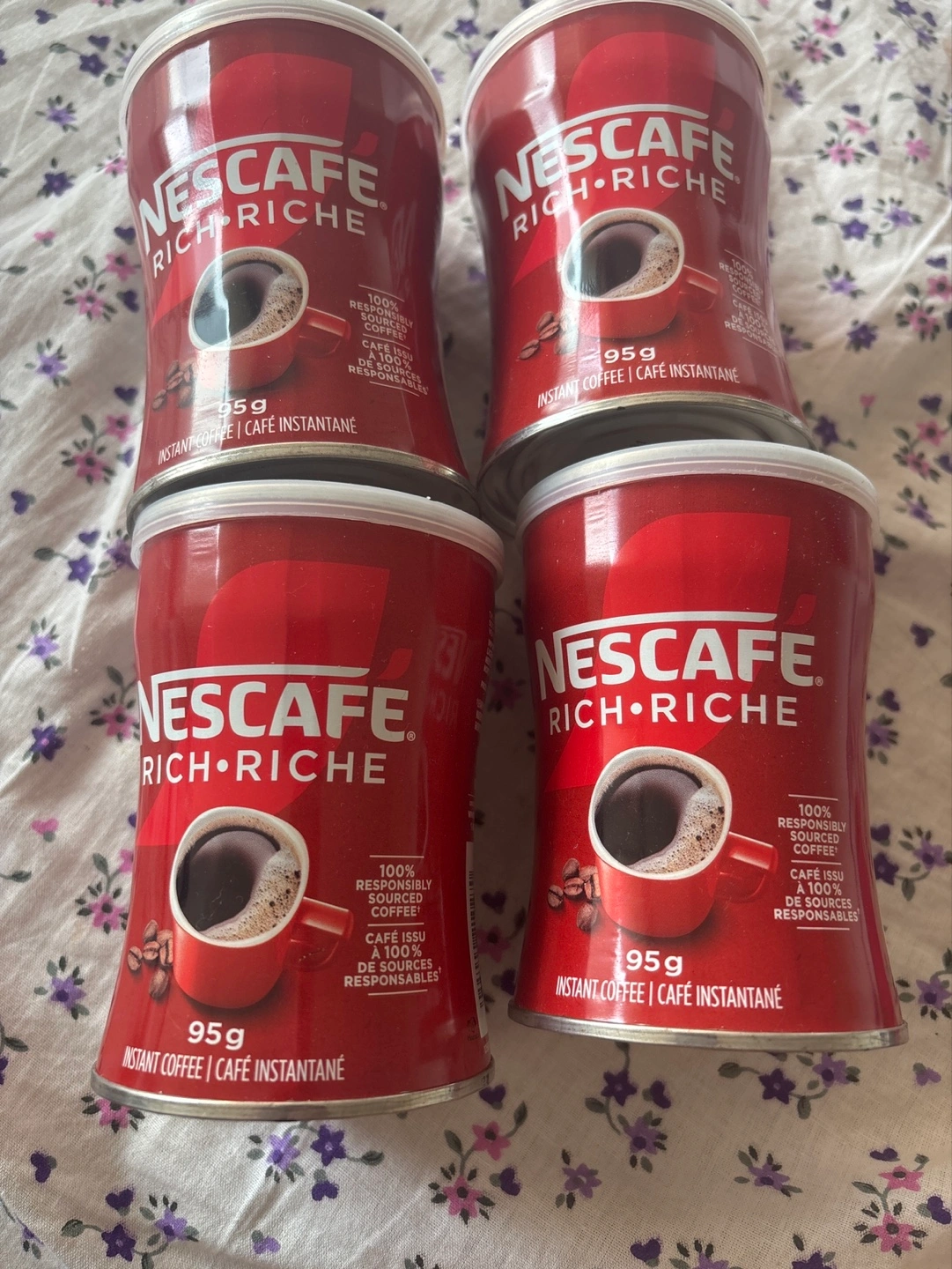 Four 95g cans of Nescafé Rich Riche instant coffee. 100% responsibly sourced coffee.