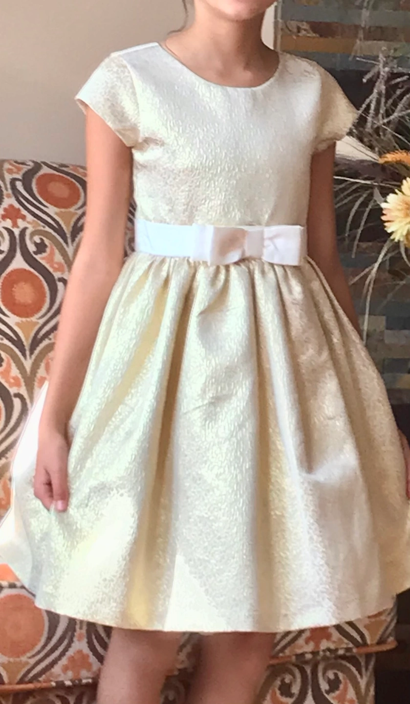Adorable girls' dress size 8 . Gold brocade fabric. Short sleeves. Fitted bodice. Full skirt. White satin bow belt. Perfect for special occasions.
