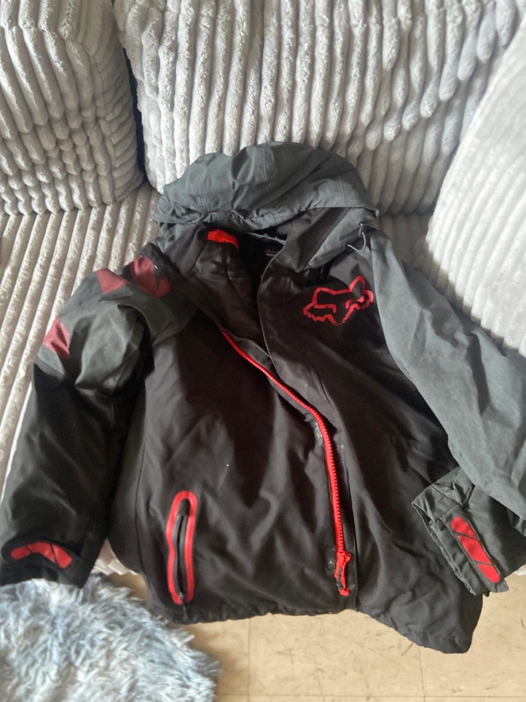 Black and grey youth snow jacket. Red accents. Zipper closure. Attached hood. Good condition.