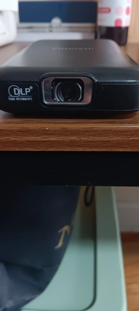 Small and compact projector. Features include HDMI input, focus adjustment, volume control, and power button. Uses DLP technology from Texas Instruments.
