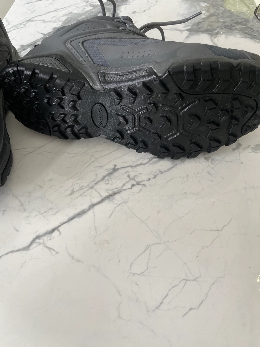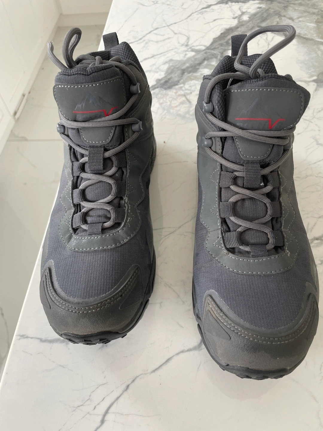 Pair of grey Nortiv8 hiking boots. Size 8. Lace-up closure. Durable sole. Good for outdoor adventures.
