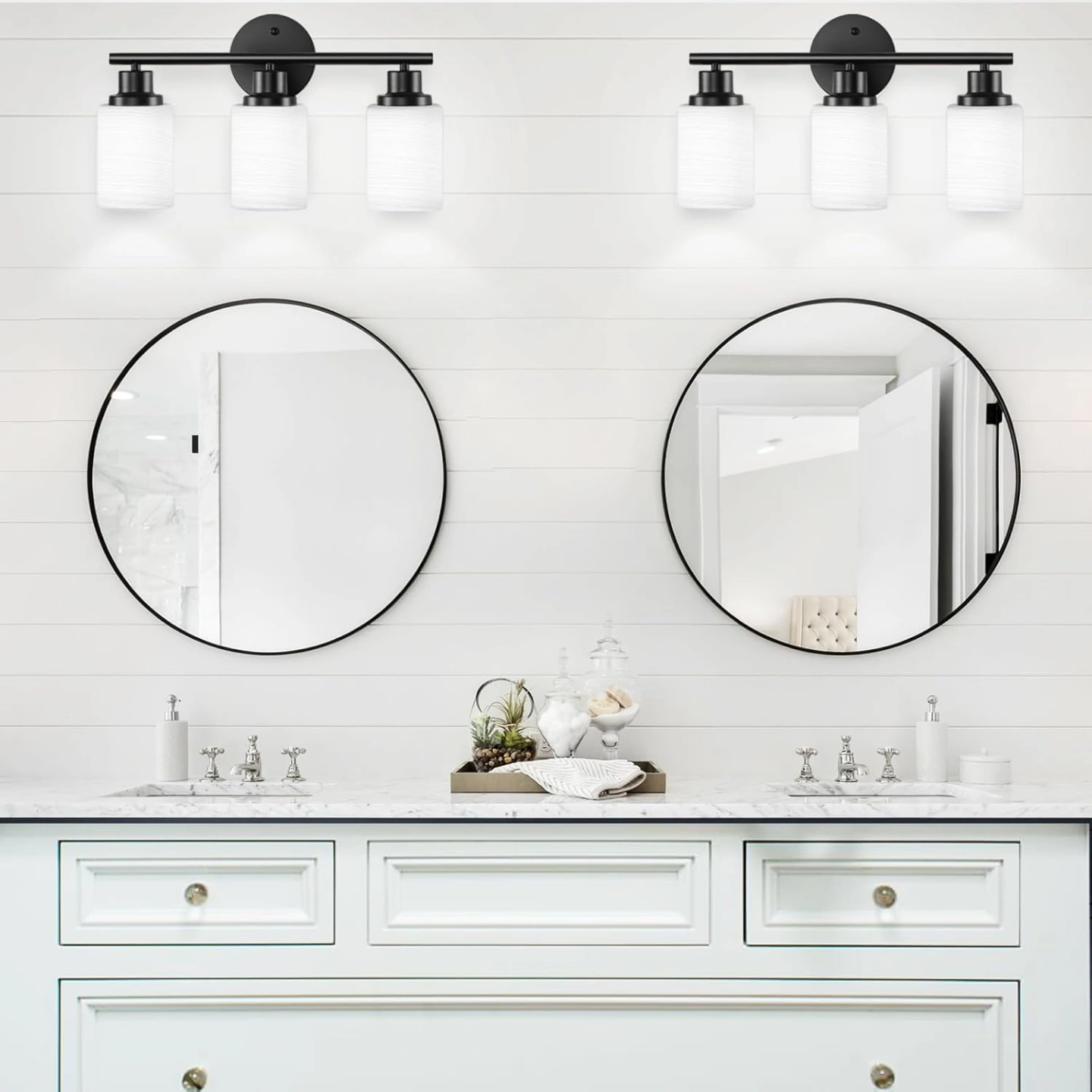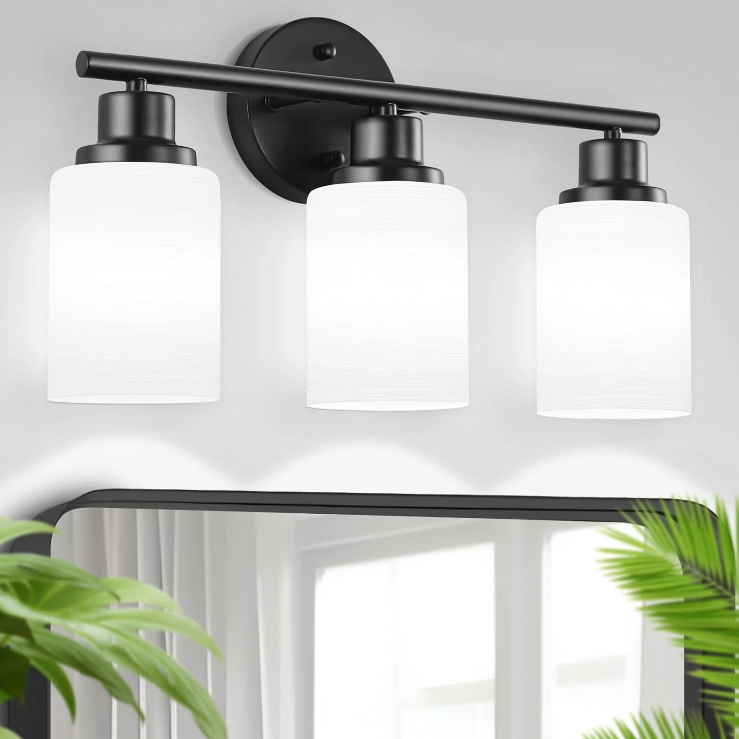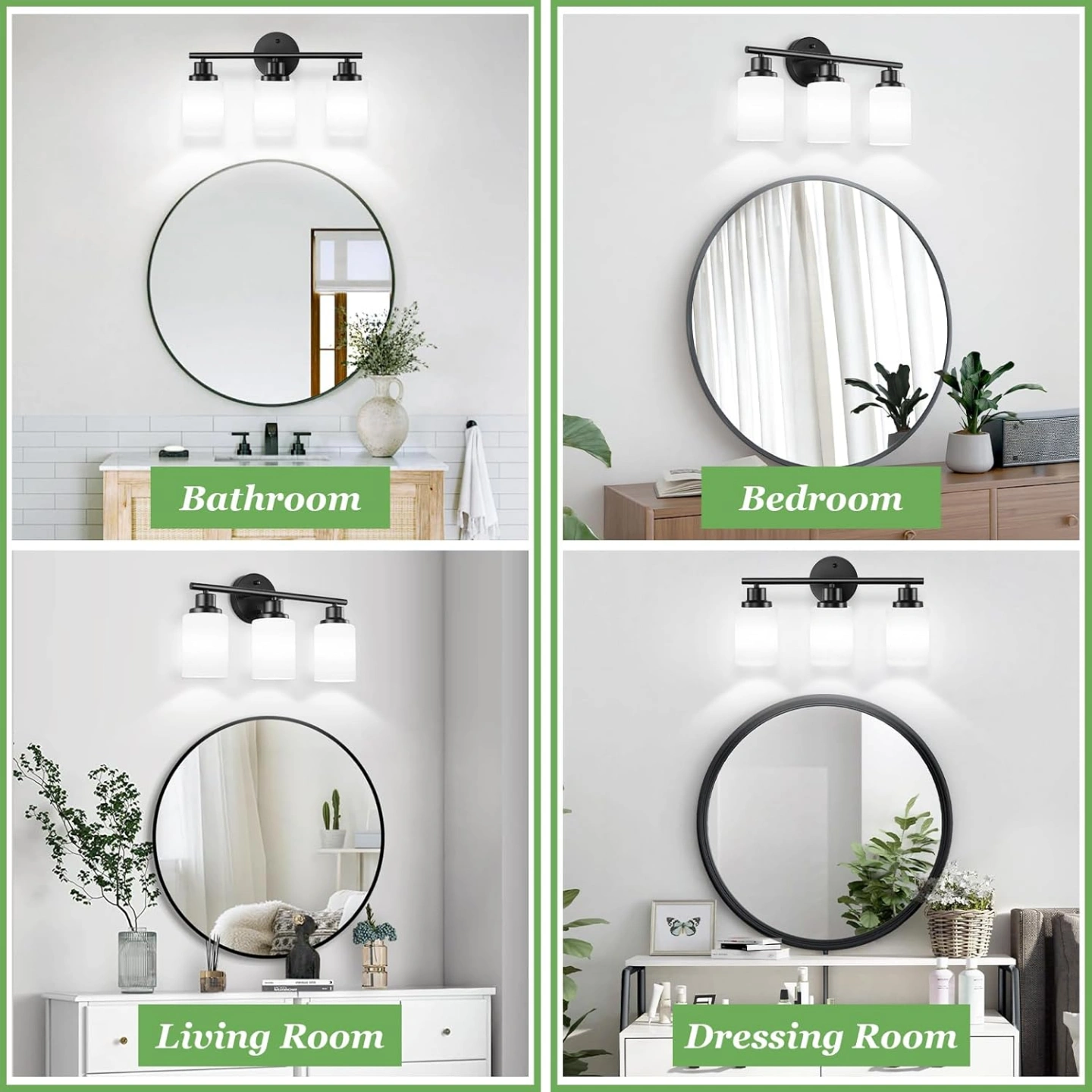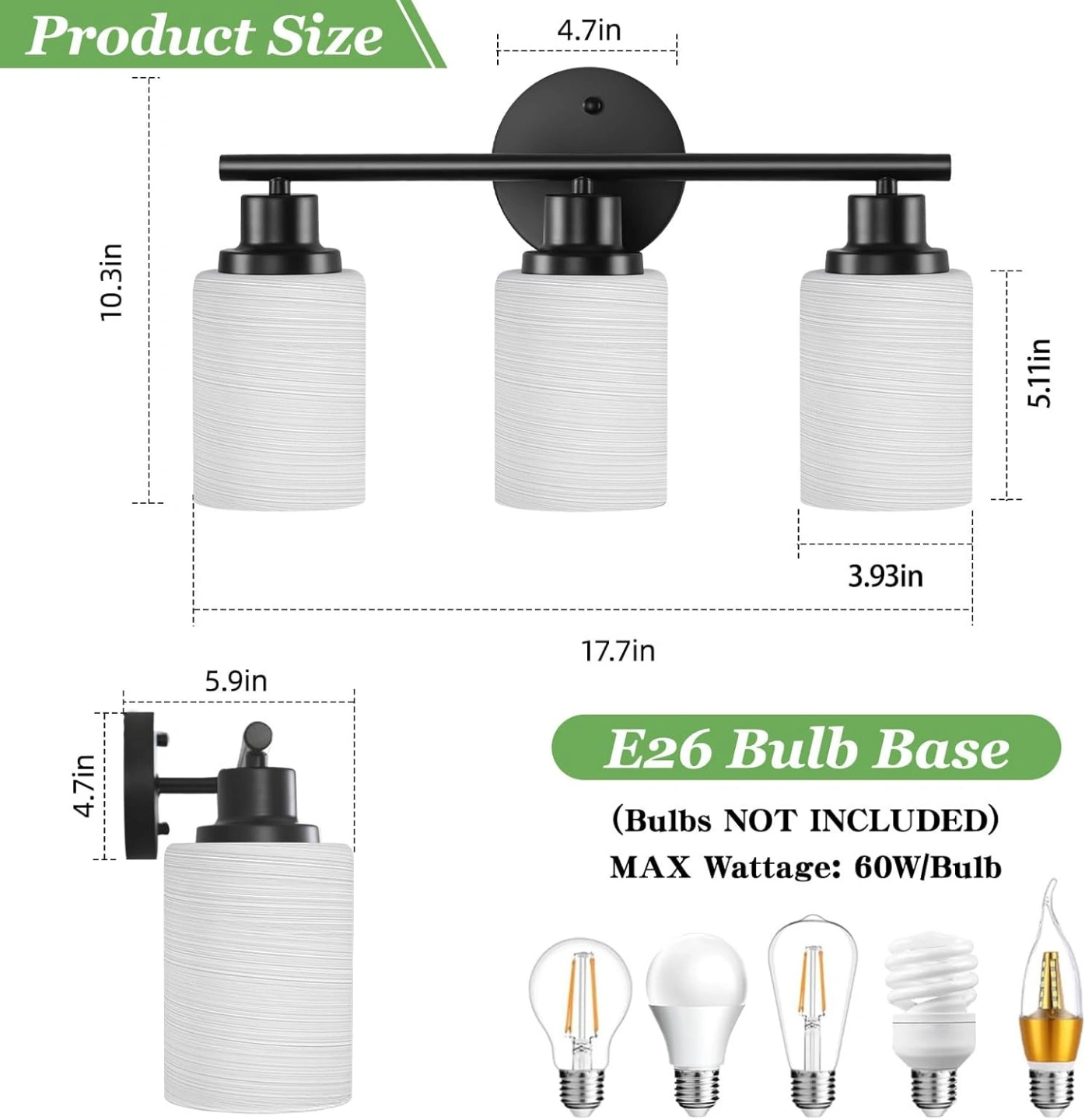 754Black Bathroom Light Fixture, 3-Light Vanity Lights with Milky White Frosted Glass Shade, Vanity Light for Bathroom, Modern Wall Lamp for Mirror, E26 Base, Brand New in the Box/Sealed Features: Eye-Caring Lampshade - Crafted from milky white frosted glass, black bathroom light fixture diffuse light to reduce glare and eye strain. Ideal for makeup and grooming, black vanity light enhance comfort and visibility for extended use Matte Black Finish - Bathroom light fixtures are crafted from metal material with a matte black finish, ensuring sturdy and long-lasting performance. With classic modern style, they bring a touch of high-end texture and elegance to your bathroom and vanity areas Heat-Resistant E26 Base - 3-Light Matte black vanity lights feature a heat-resistant E26 base that supports standard bulbs up to 60W (BULB NOT INCLUDED). Compatible with incandescent, LED, CFL, and halogen bulbs for easy replacements Up and Down Reversible Mounting - Vanity light fixture package include all mounting accessories and instruction for a hassle-free setup. Connect wires, attach glass shade and bulb (BULB NOT INCLUDED), and choose upward or downward positioning