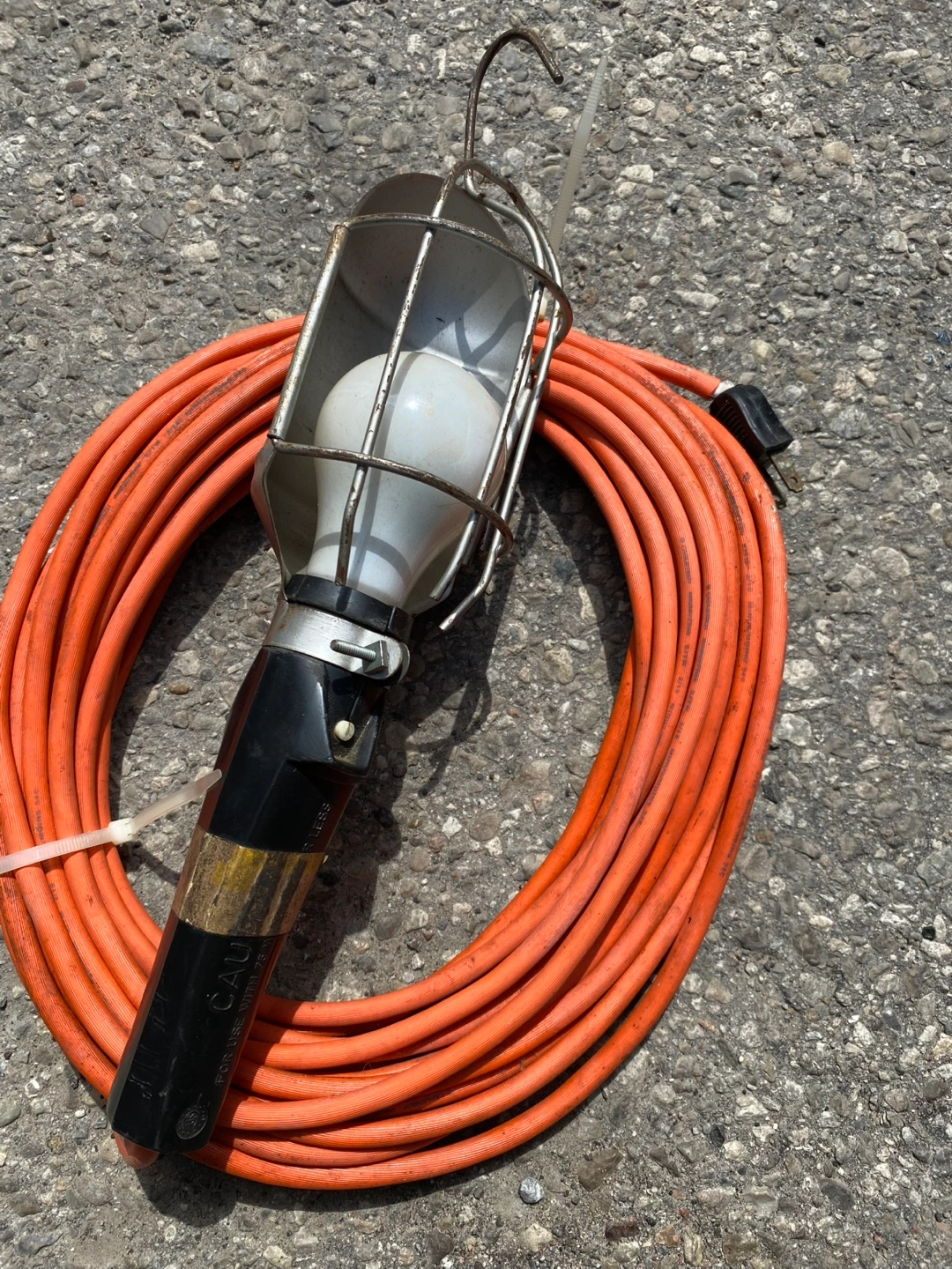 Portable work light. Metal cage surrounds bulb. Long orange extension cord included. Durable construction. Ideal for various outdoor uses.