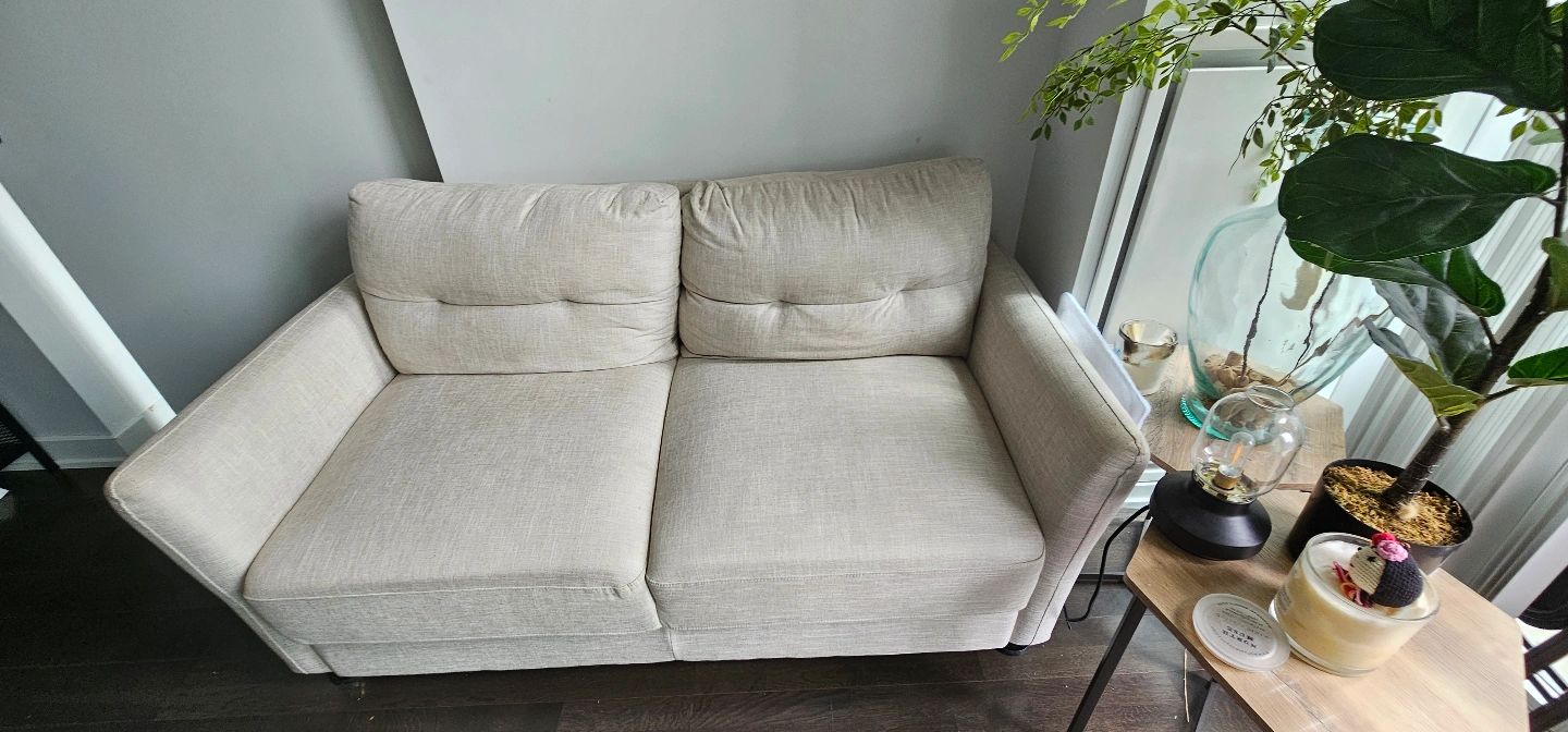 Two-seater sofa, an excellent option for a condo unit. Dimensions: 150 cm × 80 × 60. It can be disassembled. Very comfortable and in excellent condition. No cats, no dogs, and no smokers.