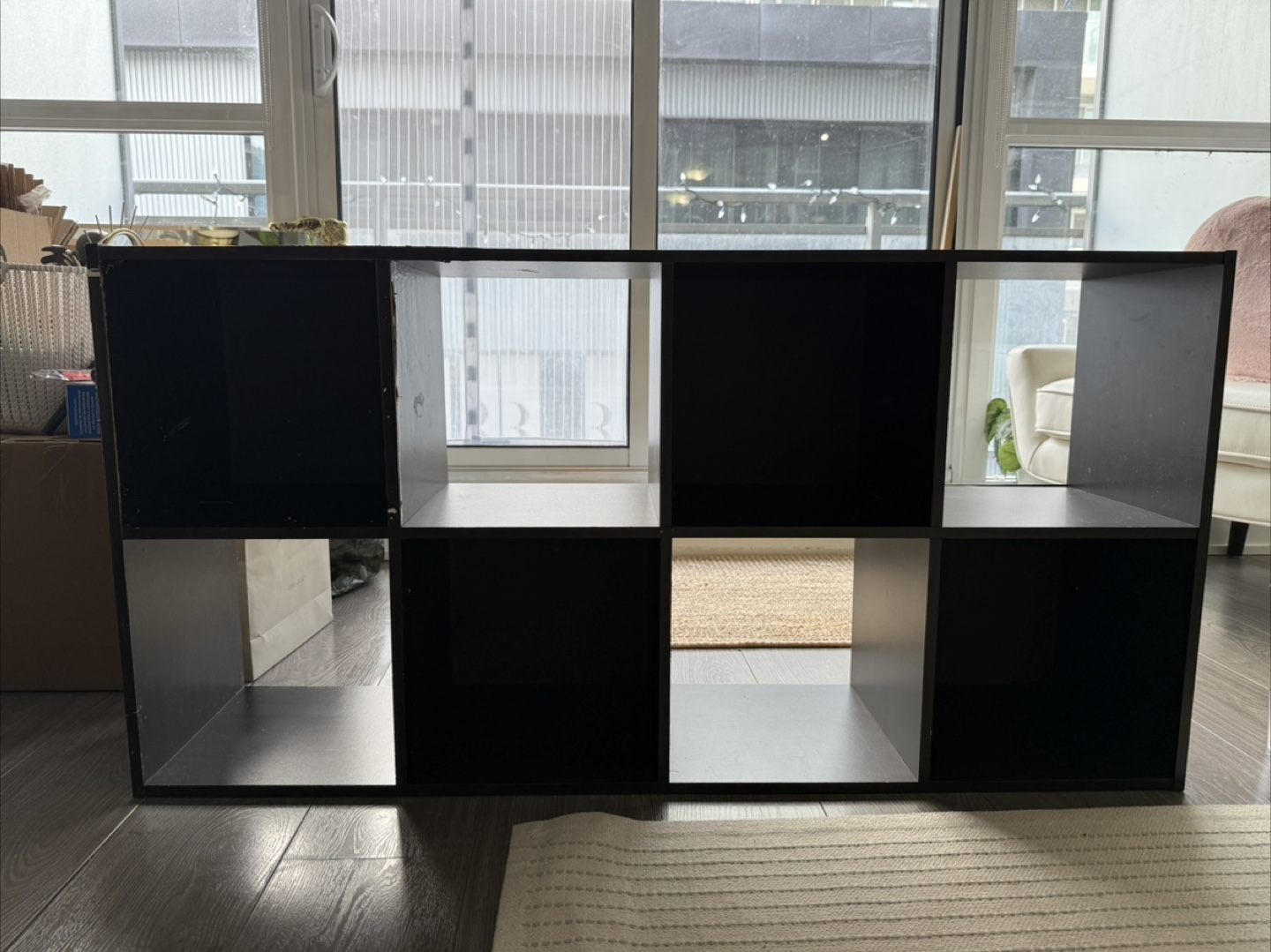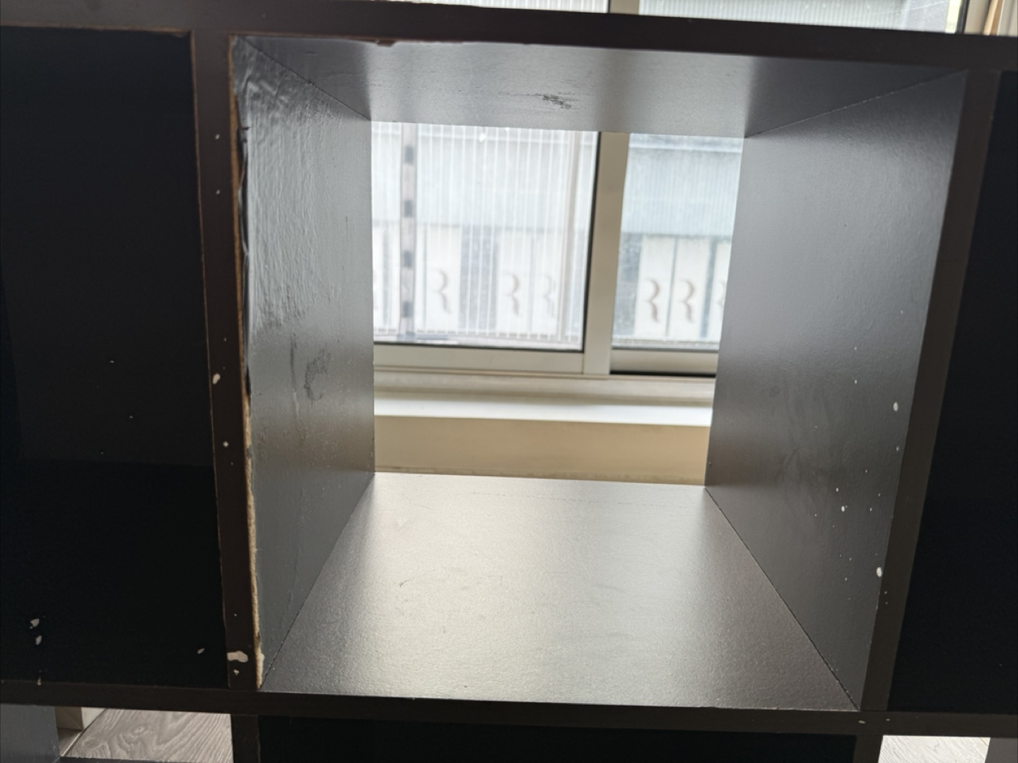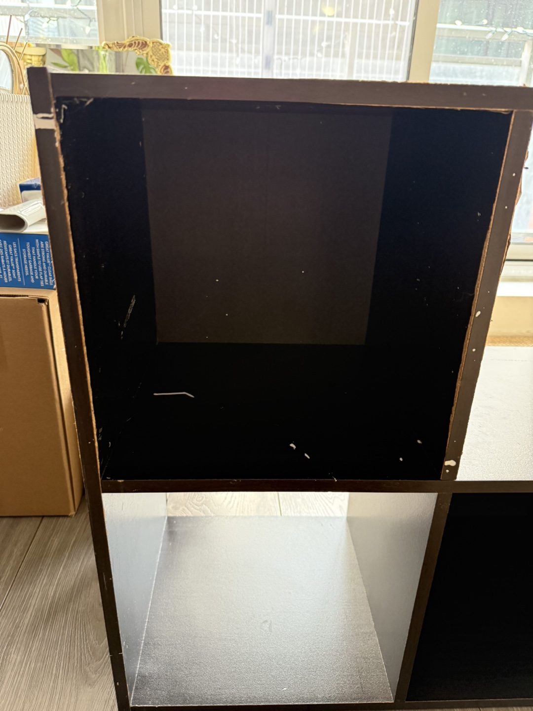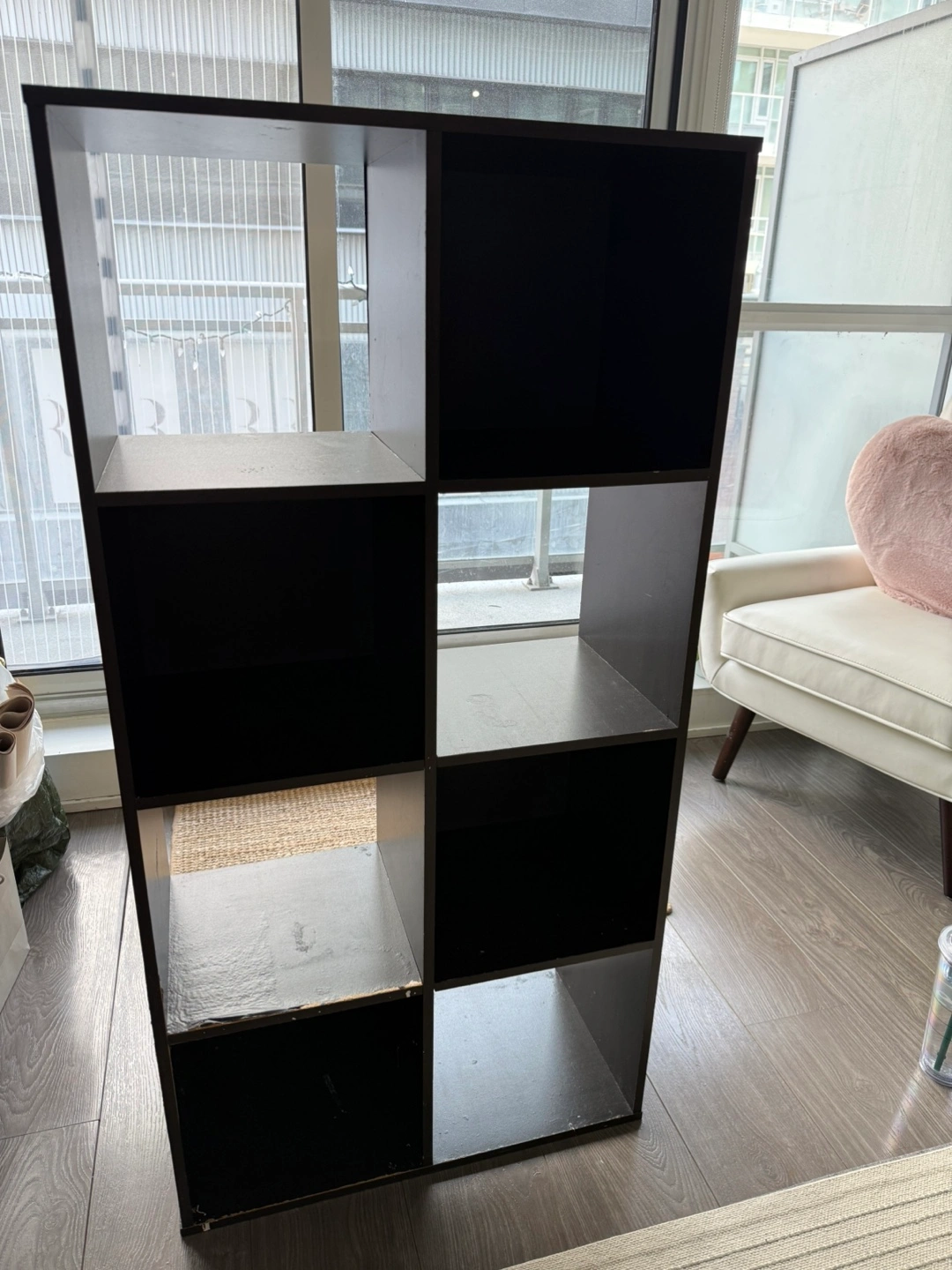 Nine-cube organizer. Dark brown/black finish. Some cosmetic damage- could use a new finish. Great for storage or organization. Very sturdy, a bit heavy!