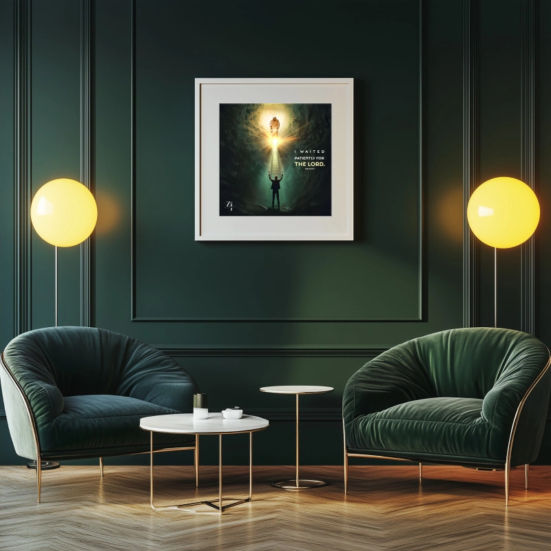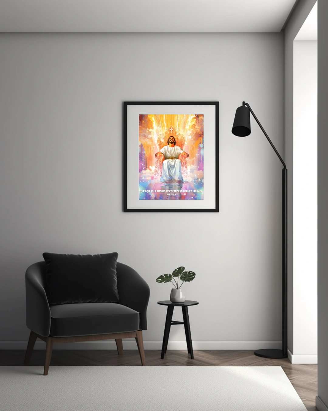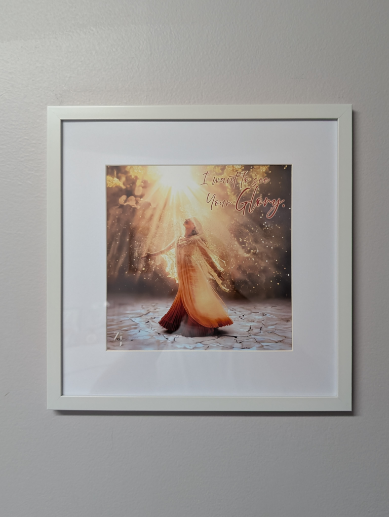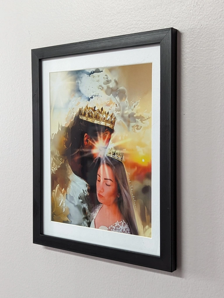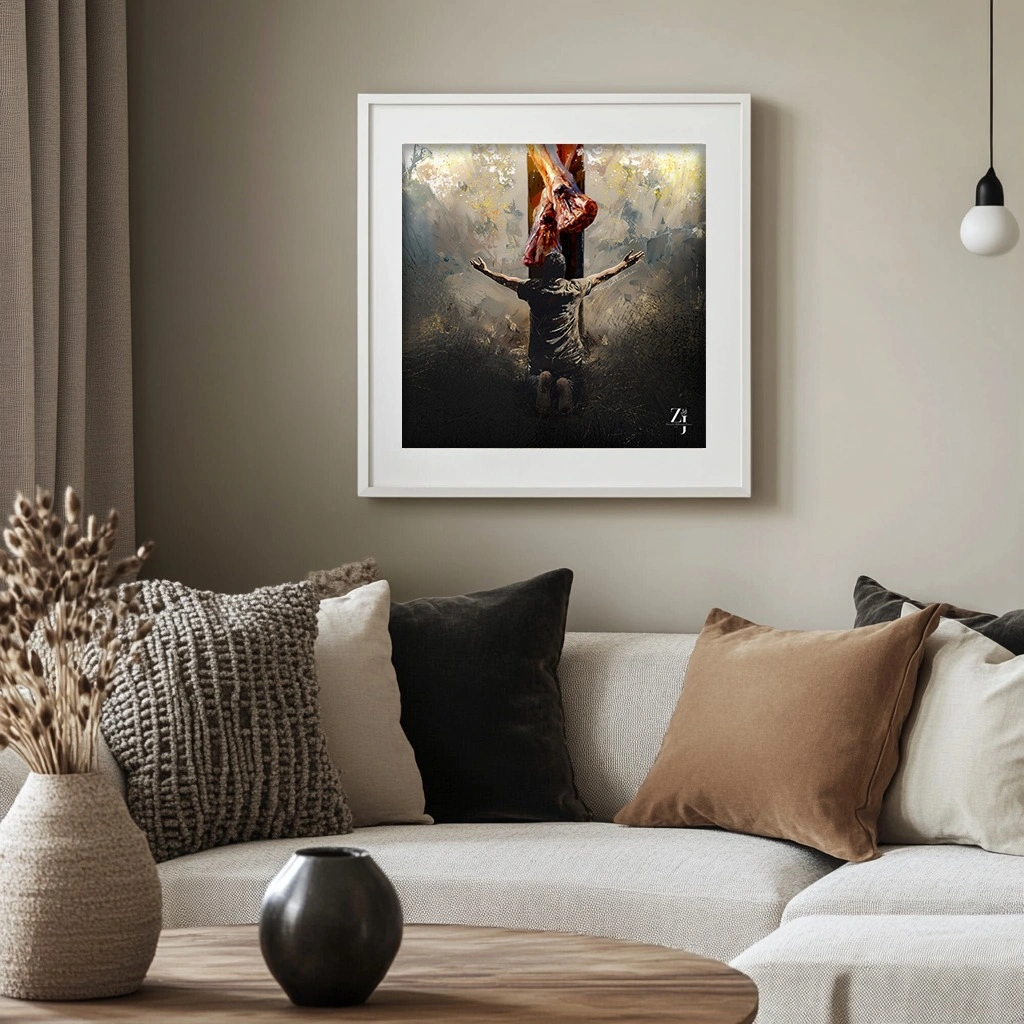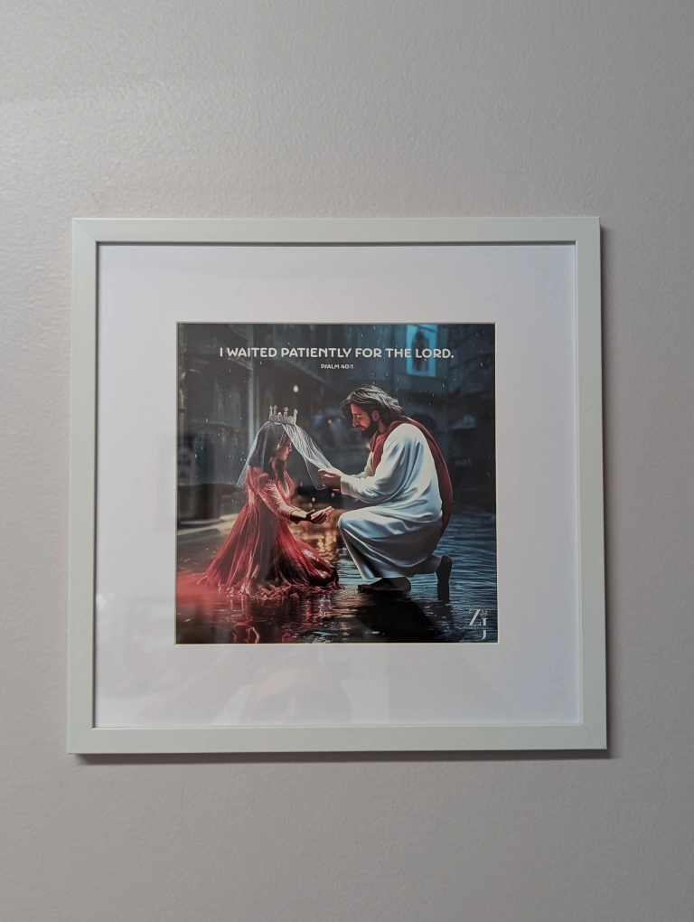 Framed prints featuring Christian-themed imagery and scripture. White frames. Various sizes. Perfect for home décor.