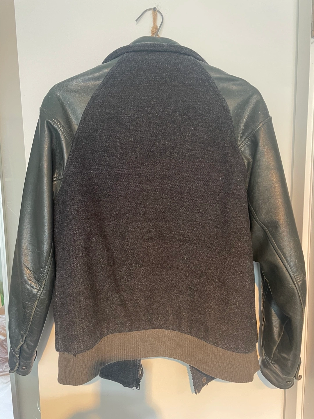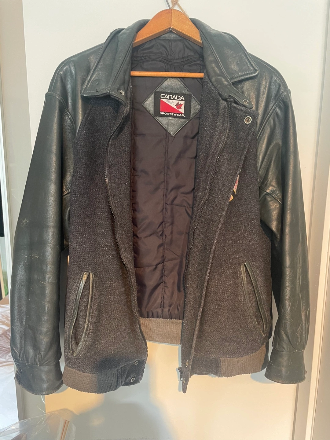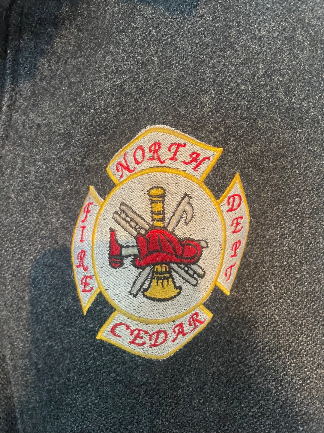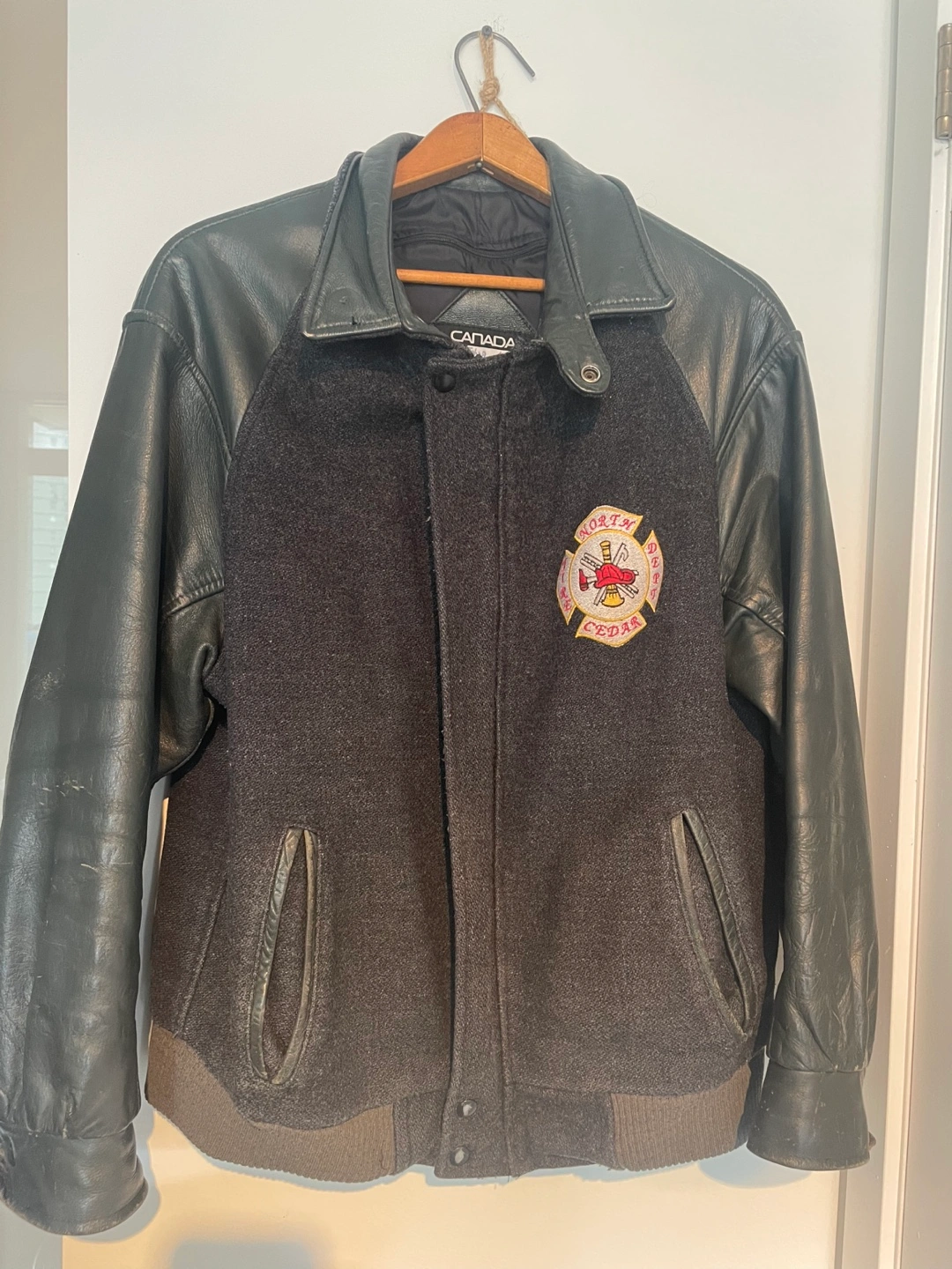 Men's vintage leather varsity jacket. Features a dark grey wool body and black leather sleeves. North Cedar Fire Department emblem on the back. Zipper closure. Ribbed cuffs and hem. Excellent condition.
