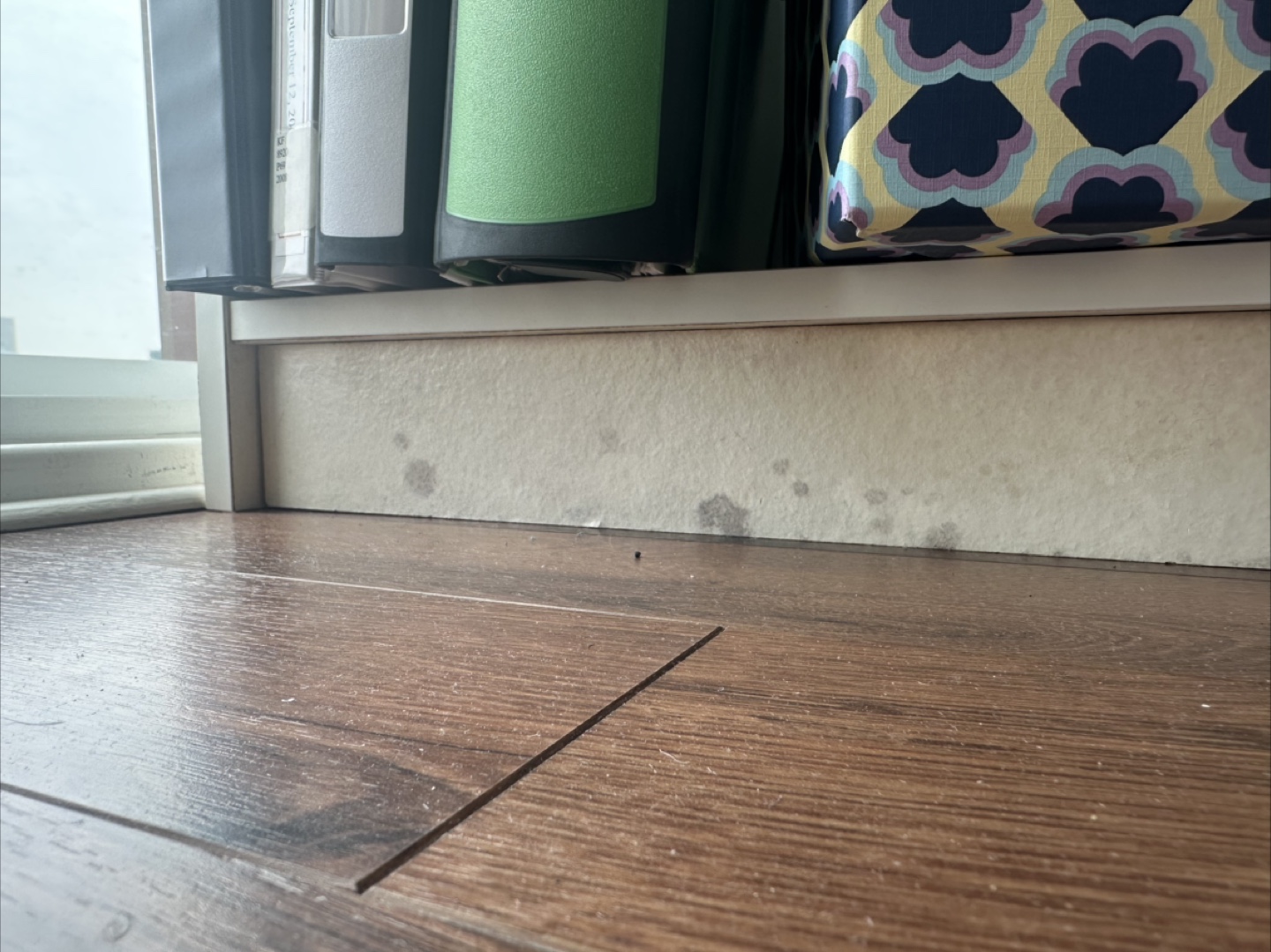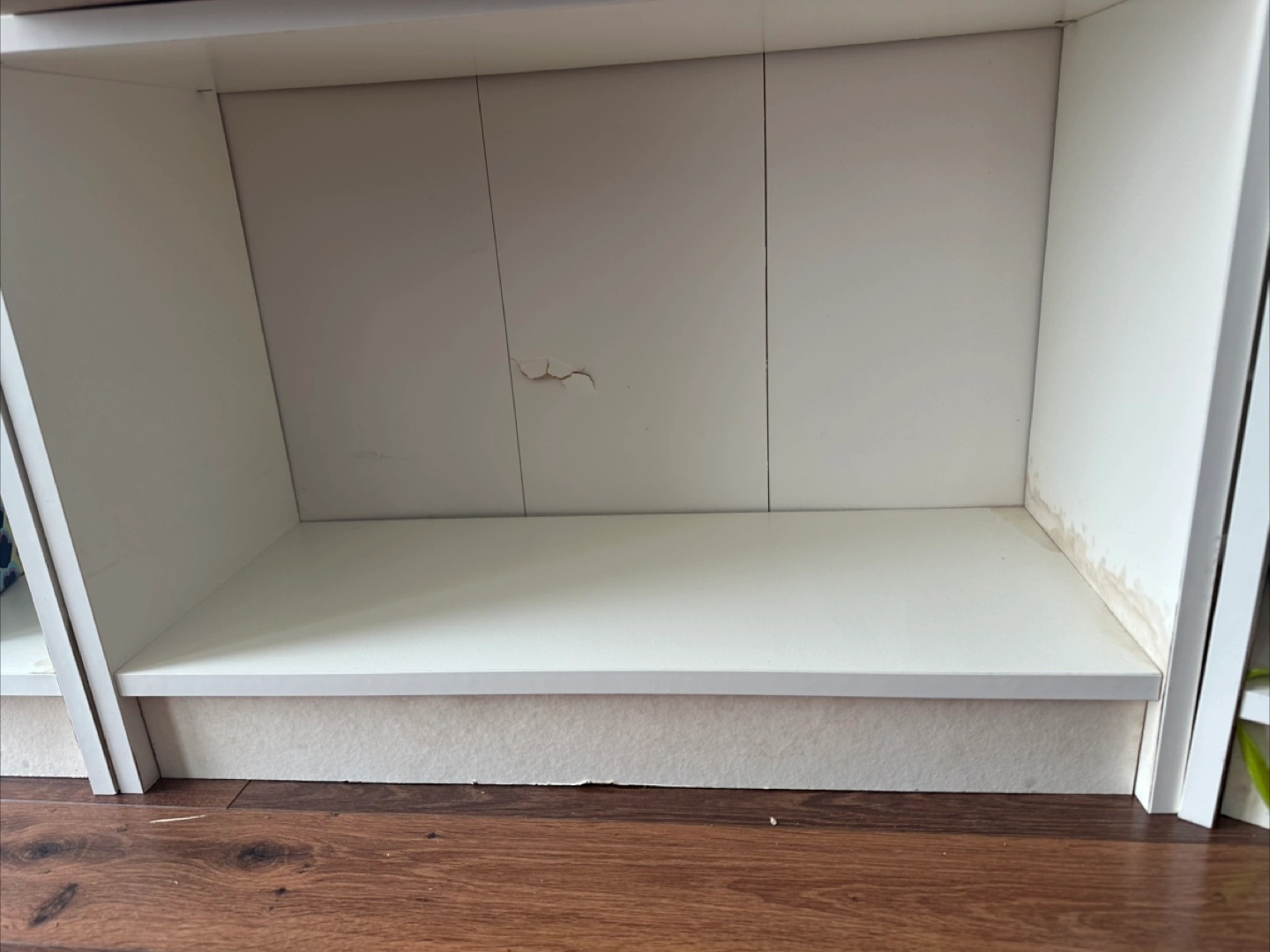 Set of three white bookcases. Multiple shelves. Good for storage or display. Some wear and tear - especially lower levels that got water damaged.