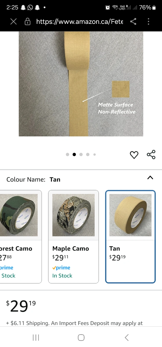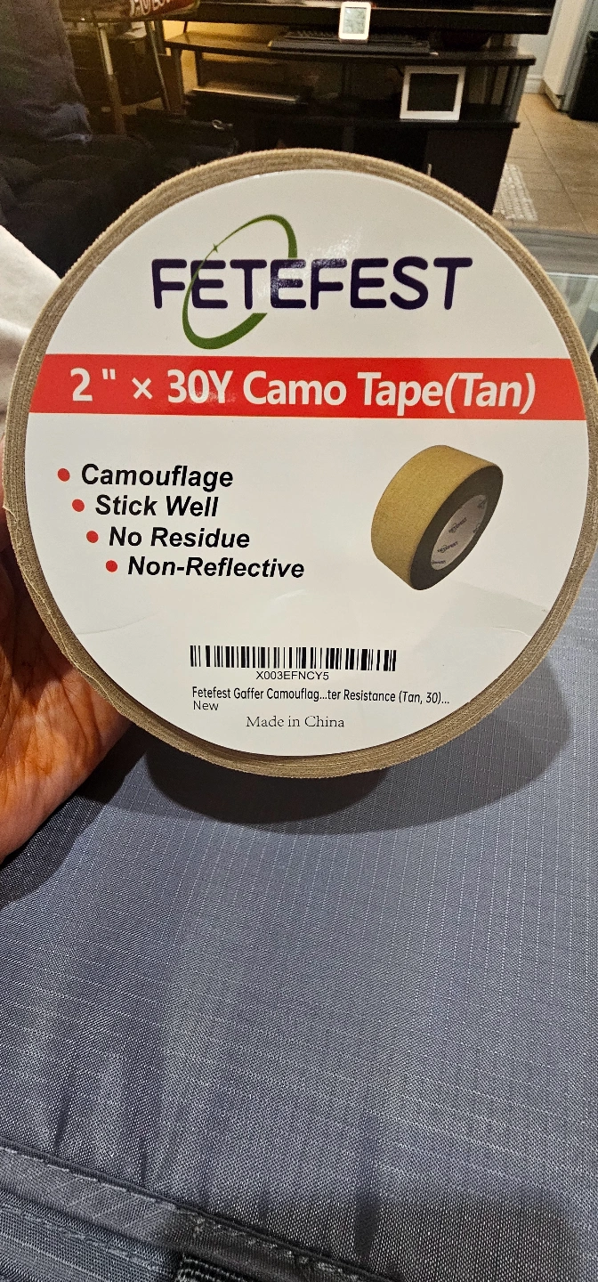 New roll of tan camouflage gaffer tape. 2 inches wide, 30 yards long. Non-reflective, leaves no residue. Sticks well.