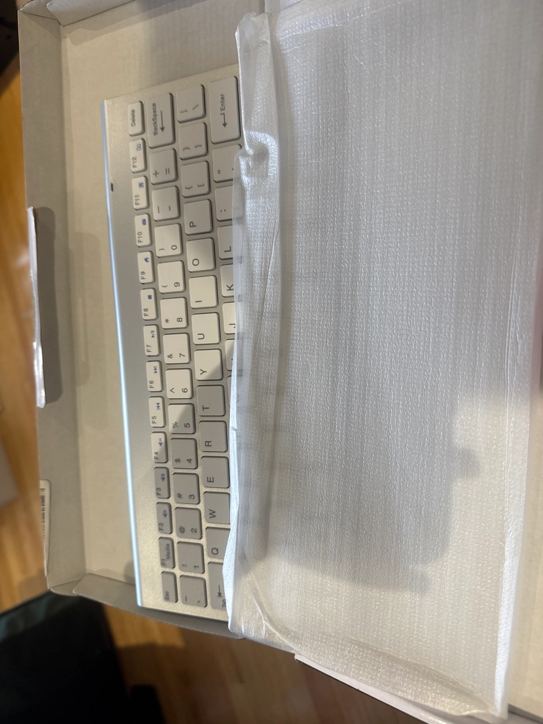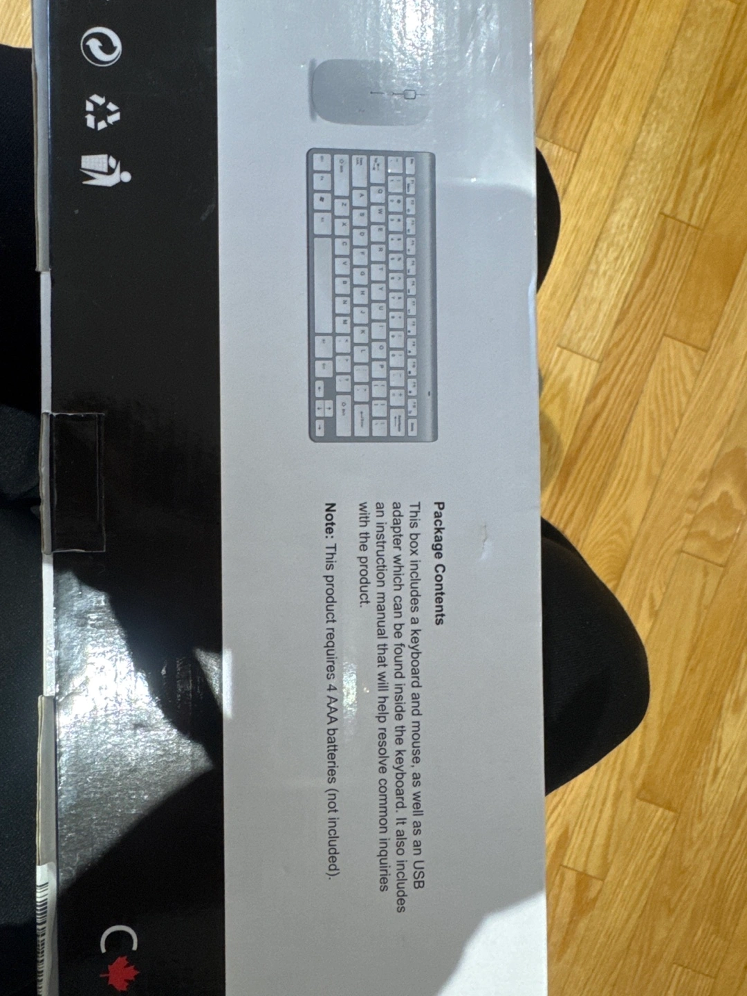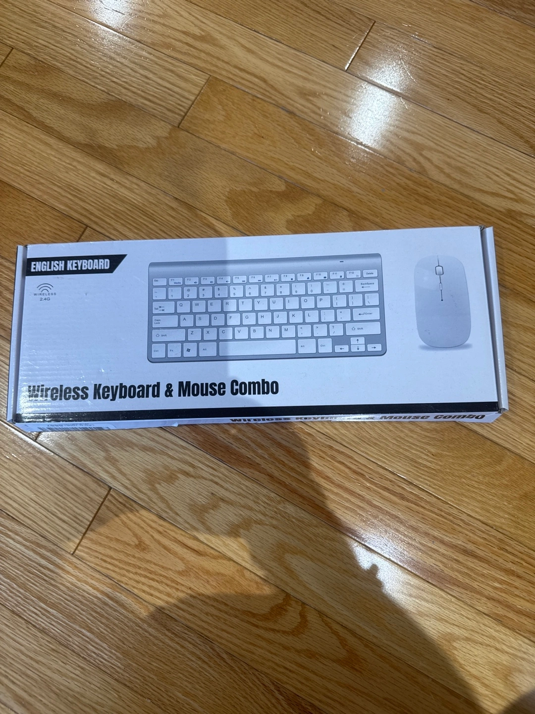 New, wireless keyboard and mouse combo. White colour. Includes USB adapter and instruction manual. Requires 2 AAA batteries