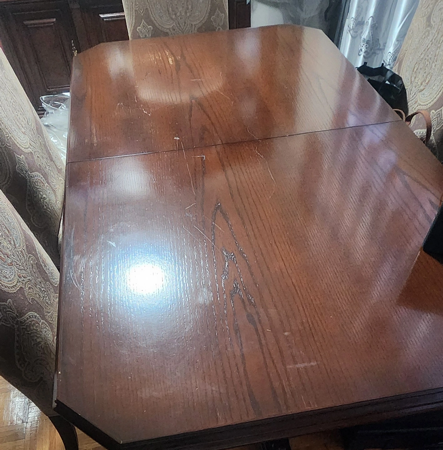 Brown wood dining table with leaf. Six matching chairs. Ornate pedestal base. Fabric upholstery on chairs. Some wear and tear.
