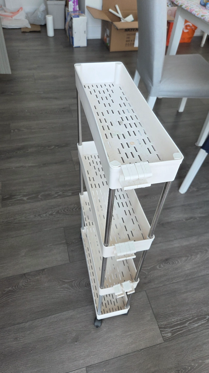 White plastic shelving unit. Four tiers. Metal frame. Wheels for mobility. Great for organizing kitchen or bathroom items in narrow spaces. Lightweight and easy to assemble.