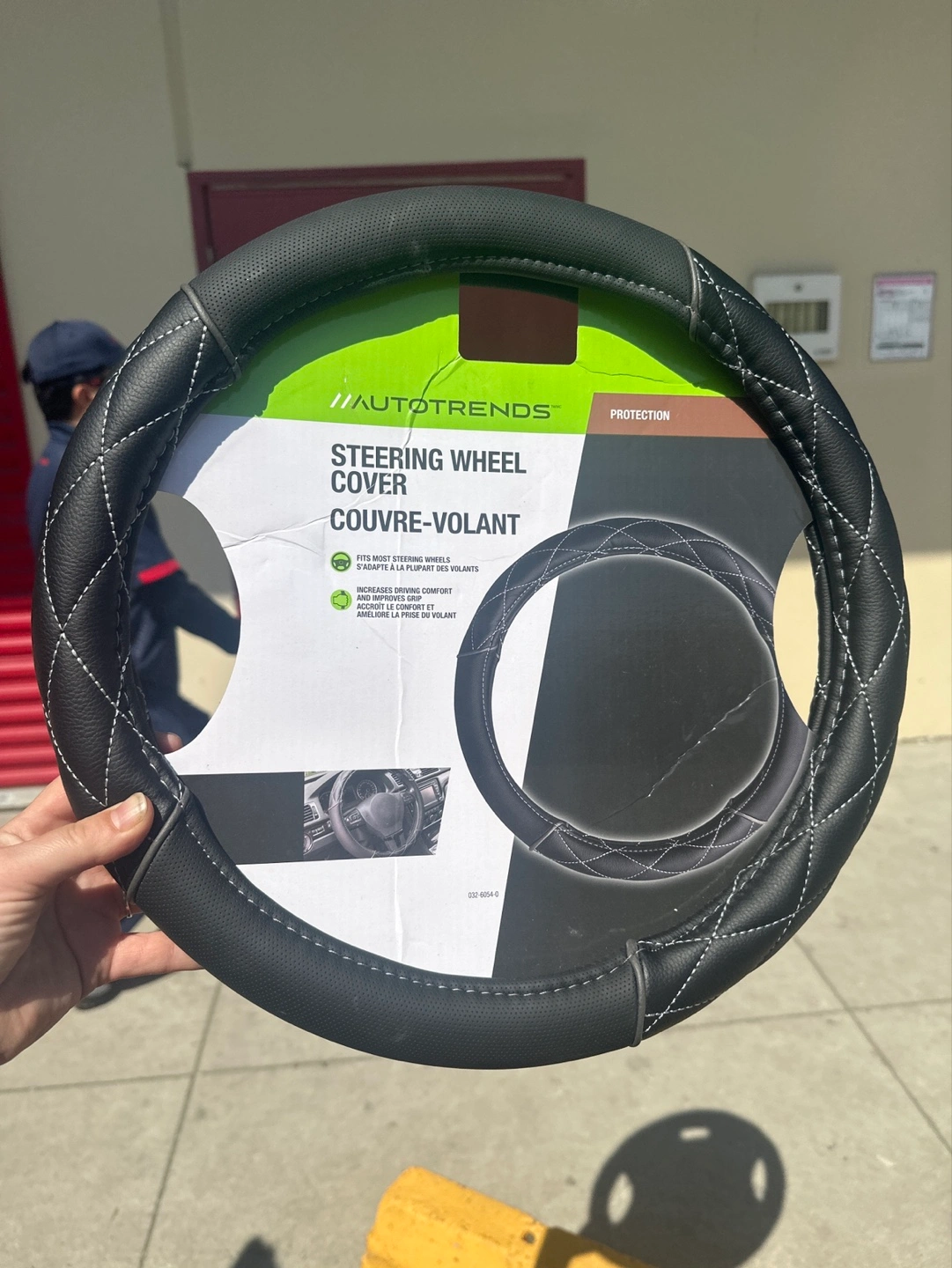 New AutoTrends steering wheel cover. Black with white diamond stitching. Universal fit. Protects against wear and tear. Increases driving comfort.