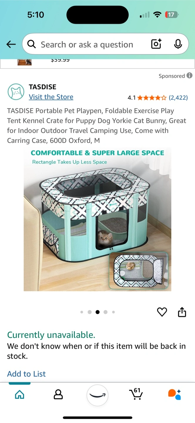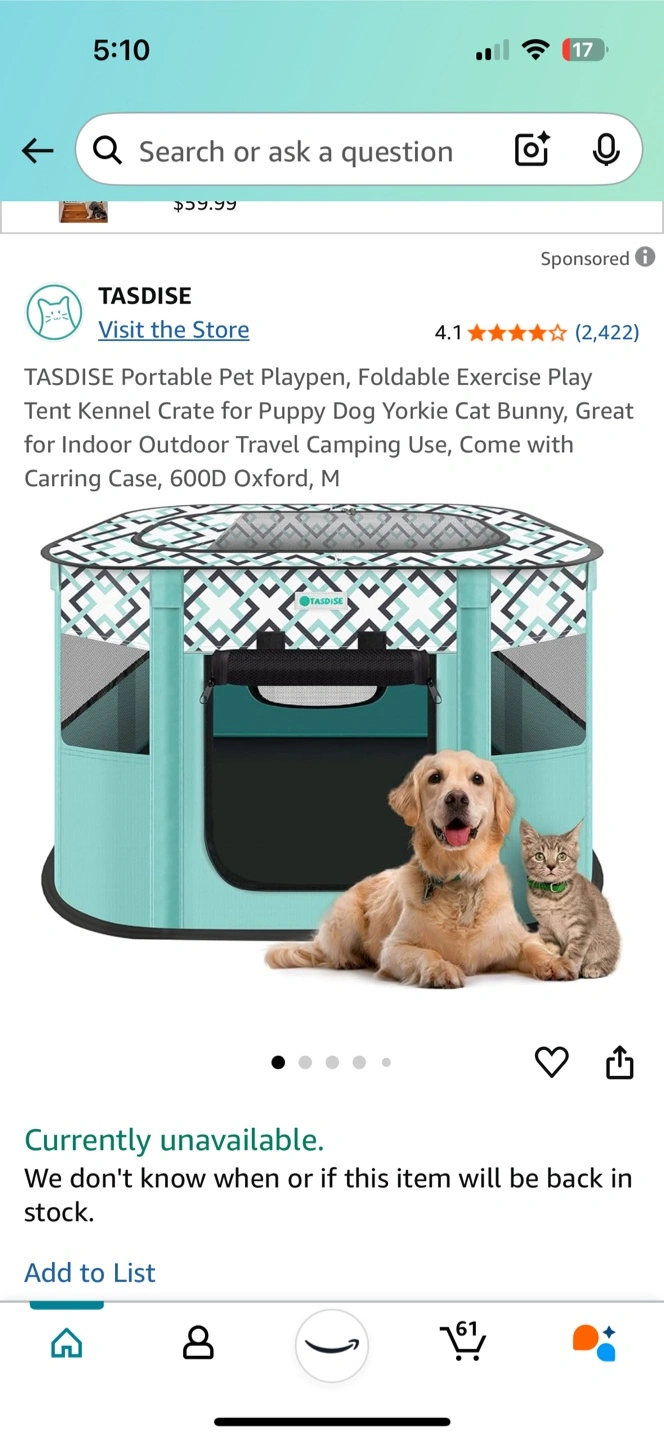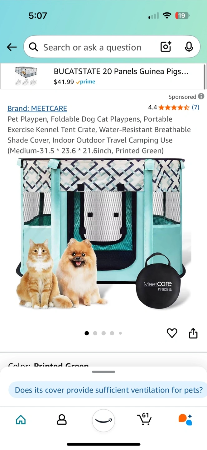 Foldable pet playpen. Great for indoor or outdoor use. Easy to store. Perfect for puppies, small dogs, and cats. Comes with carrying case.
