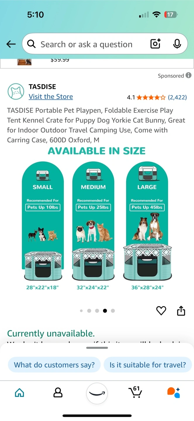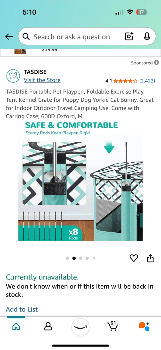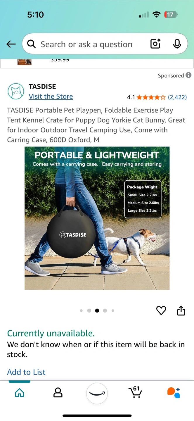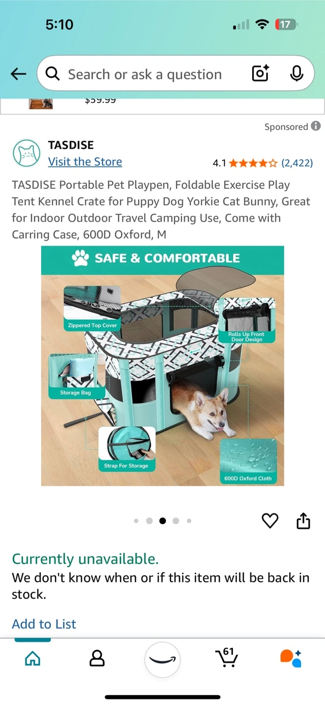 Foldable pet playpen. Great for indoor or outdoor use. Easy to store. Perfect for puppies, small dogs, and cats. Comes with carrying case.