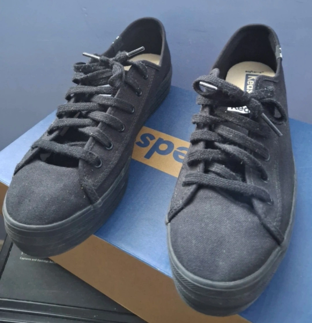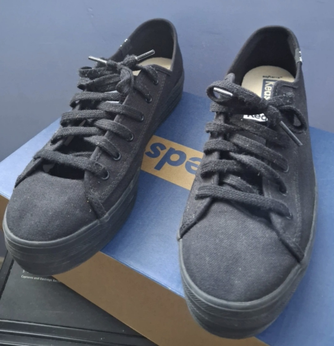 Black "Triple Kick" Keds platform sneakers, made of canvas with comfy rubber soles. Fit/look is similar to converse. In great condition; only worn like 3 times but they were a bit too narrow on my feet 😠they come in the original box.