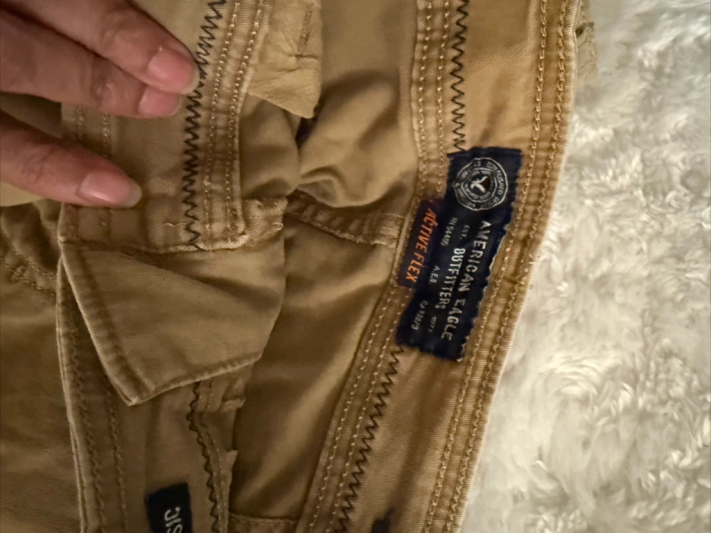 Two pairs of khaki pants. One pair by Volcom, 4-way stretch. Another pair by American Eagle, Active Flex. Both are tan coloured.