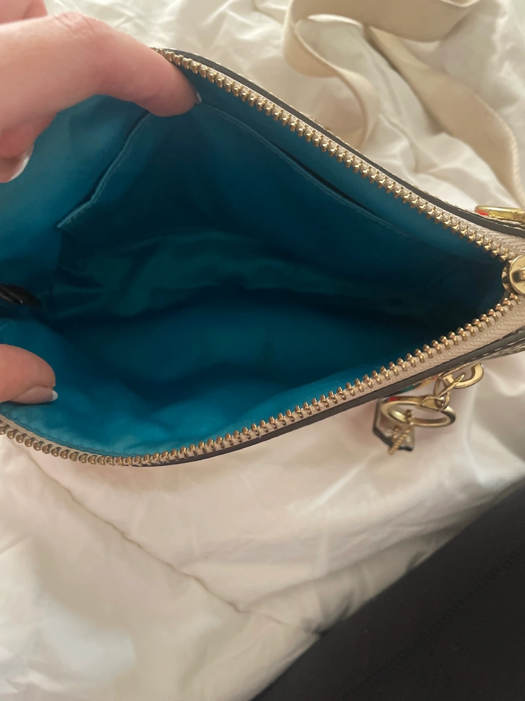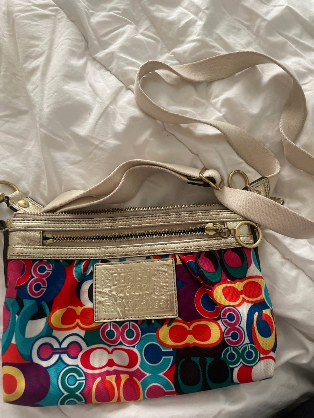 Small crossbody bag. Multicoloured pattern. Features a zipper closure and adjustable strap. Gold-toned hardware.