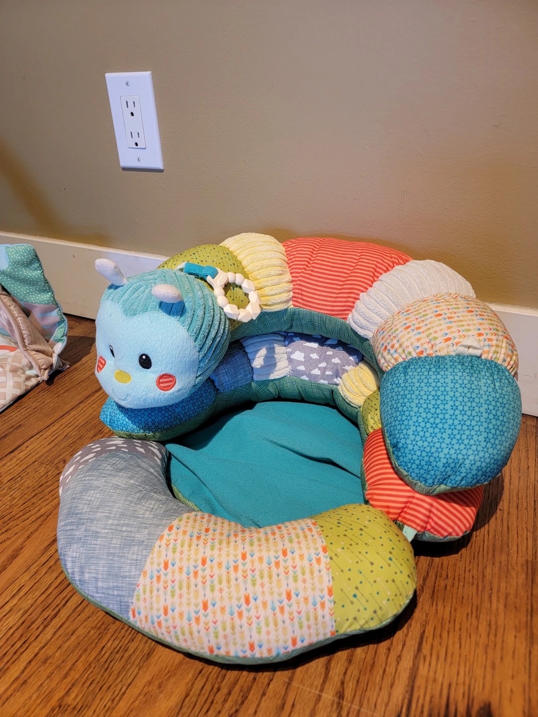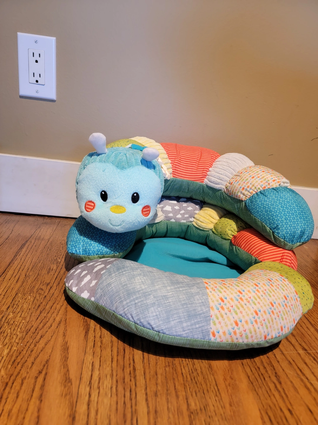 Adorable baby support seat. Soft and colourful caterpillar design. Provides support for sitting. Great for babies learning to sit. Includes a small teether.