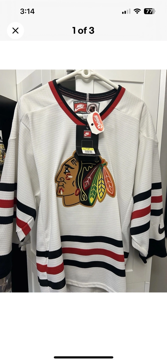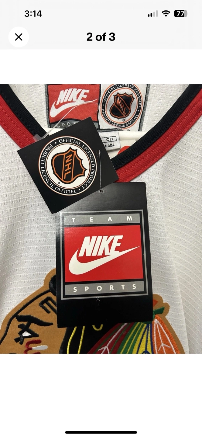 White Nike Chicago Blackhawks jersey. Features the team logo and stripes. Includes tags. Looks to BNWT - excellent condition.