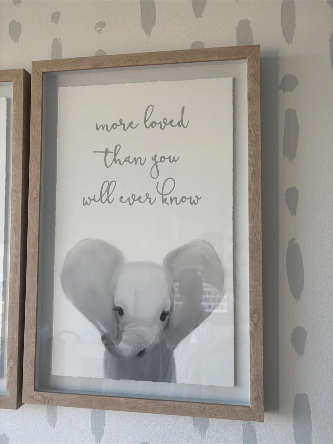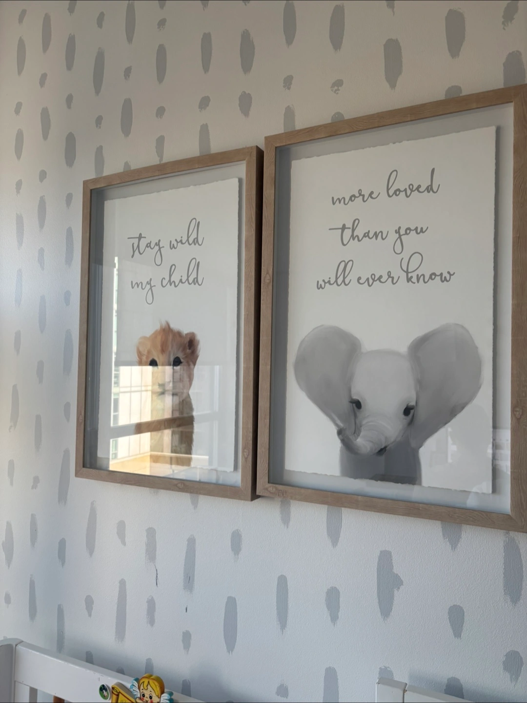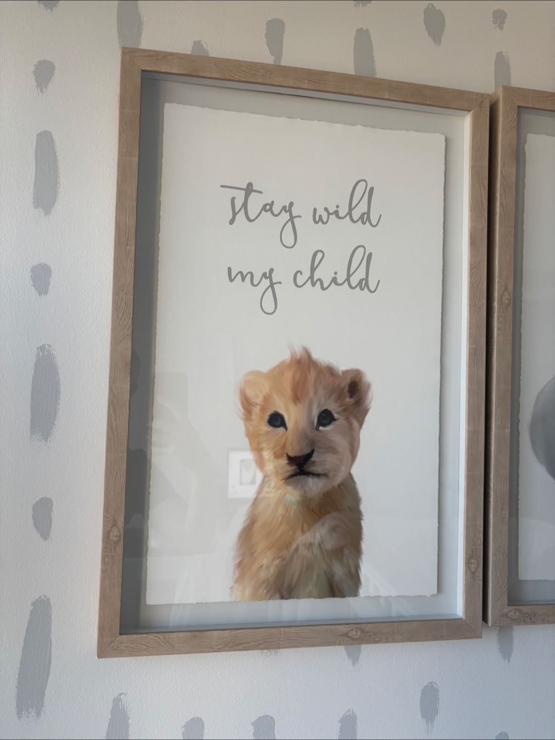Adorable framed prints featuring a lion cub and elephant calf. Natural wood frames. Perfect for a nursery or child's room. Prints feature inspirational quotes.