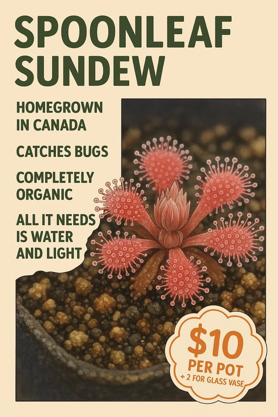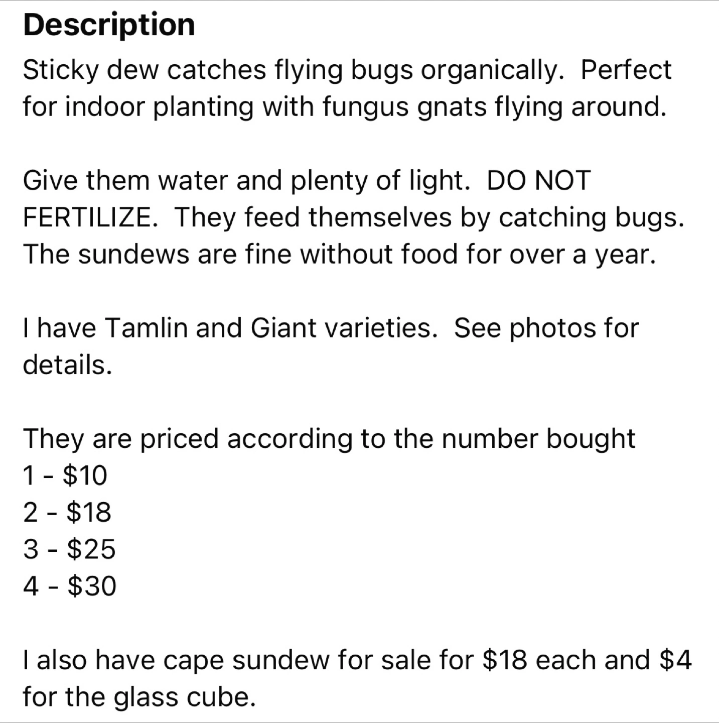 Homegrown carnivorous plants. Catch bugs organically. Perfect for indoor use. Water and light needed. Do not fertilize. Tamlin and Giant varieties available. Prices vary depending on quantity purchased. See photos and description for details.