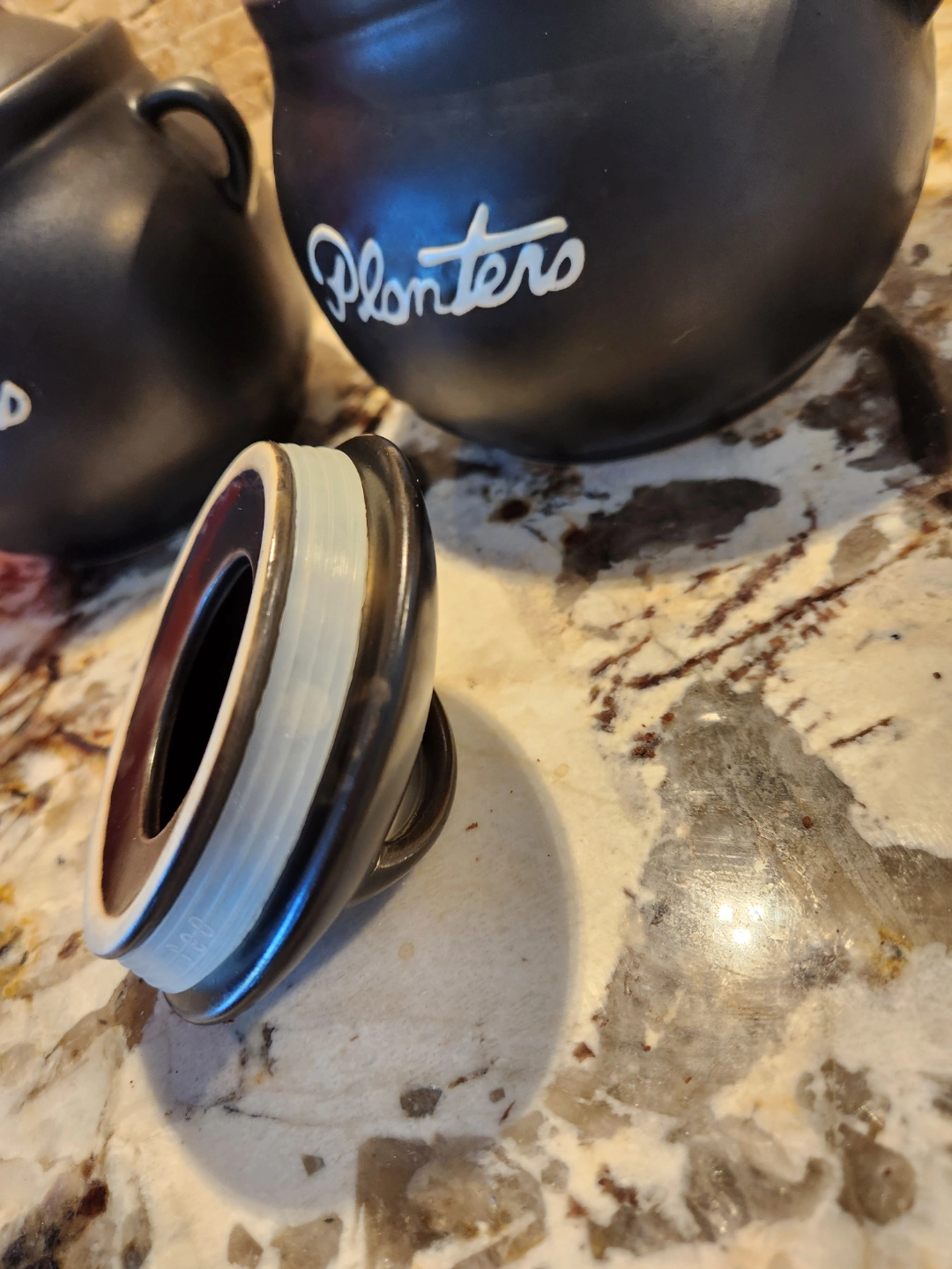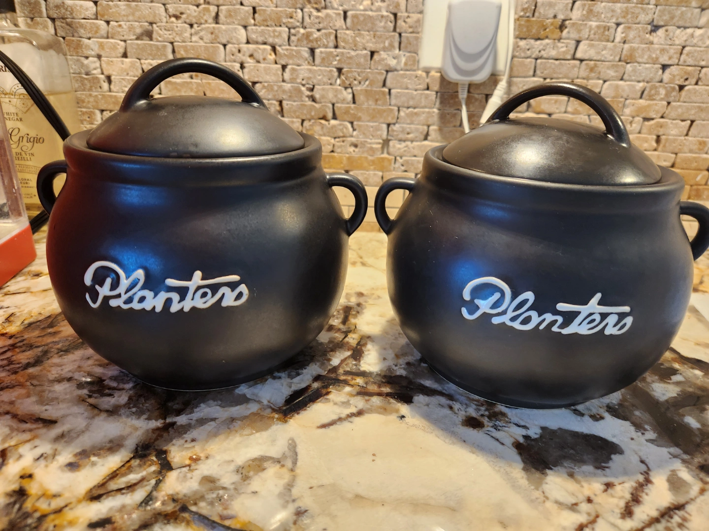 Two black ceramic Planters canisters. Each features the Planters logo. Perfect for storing snacks or other kitchen items. Good condition.