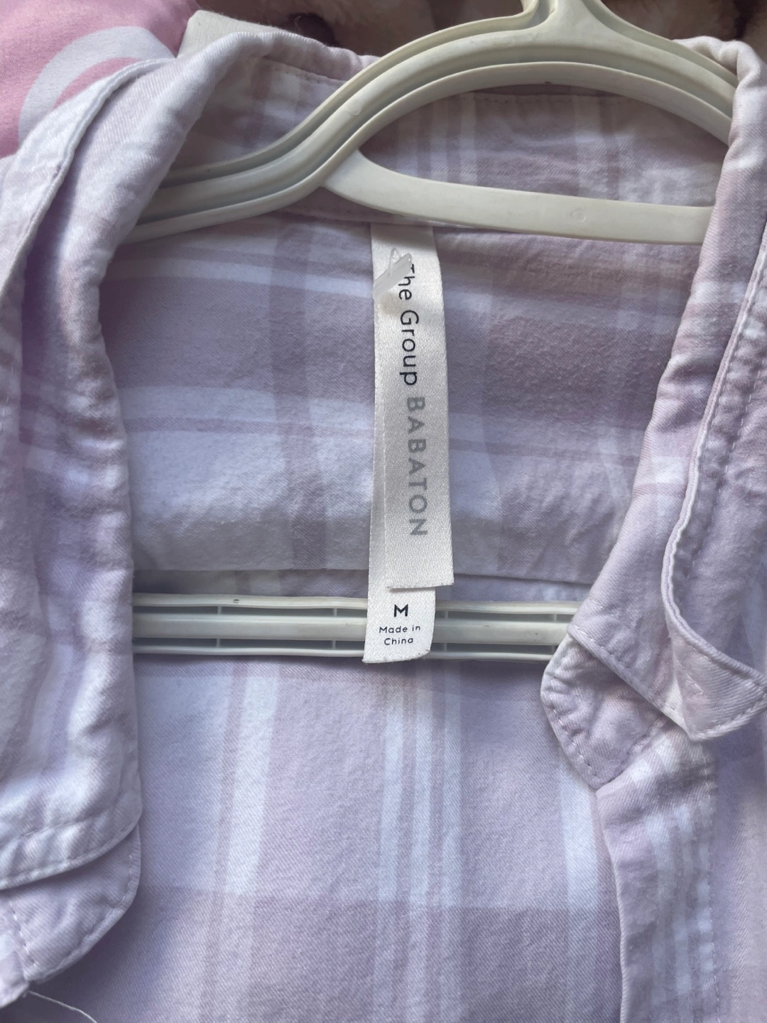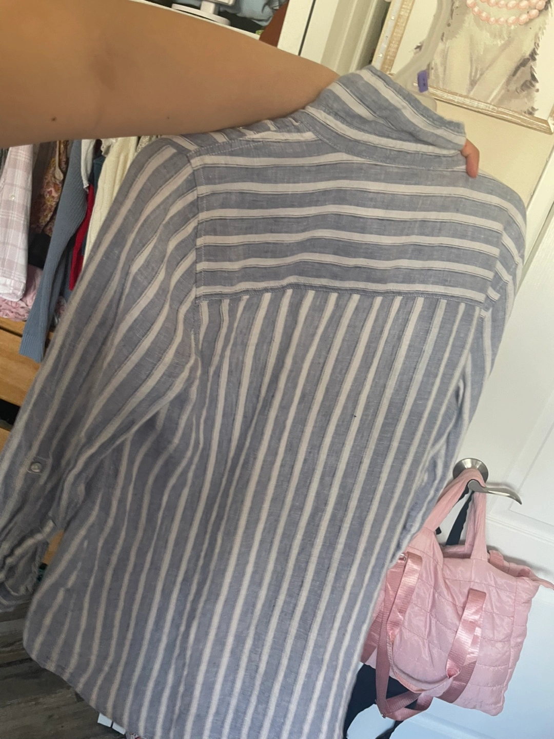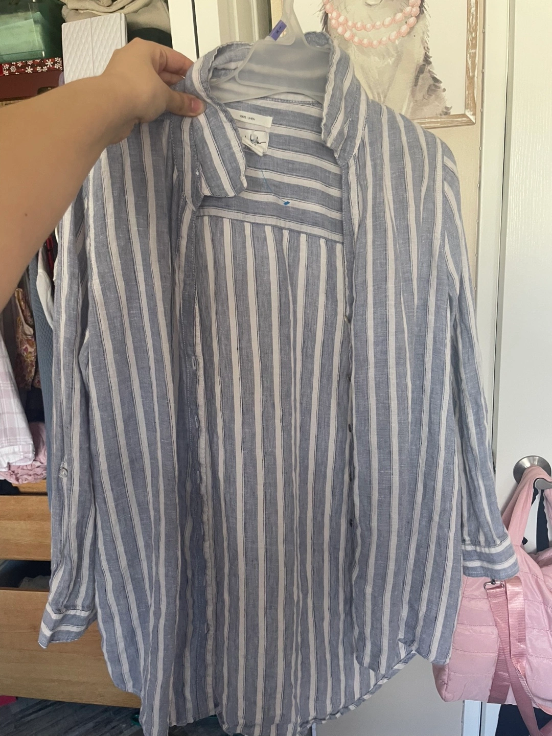 Two women's long-sleeve button-down shirts. One striped shirt is 100% linen, size medium. The other plaid shirt is size medium. Both are in excellent condition.