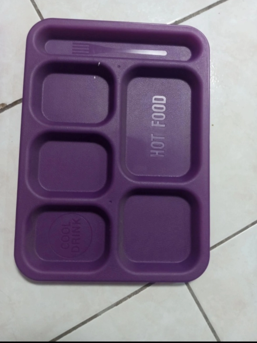 Set of two purple plastic trays. Five compartments. Ideal for lunches or picnics. Hot food and cool drink sections labelled.