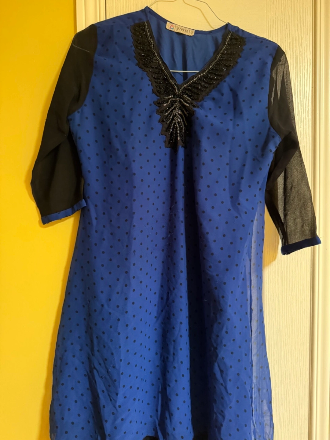 Beautiful blue women's top. Polka dot pattern. Black sleeves and neckline embellishment. Three-quarter sleeves. Slight A-line shape. ( giving away as it is small to me )