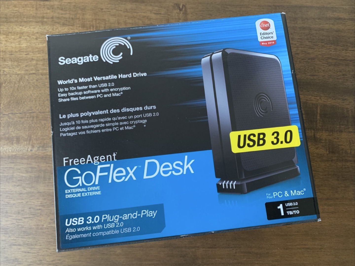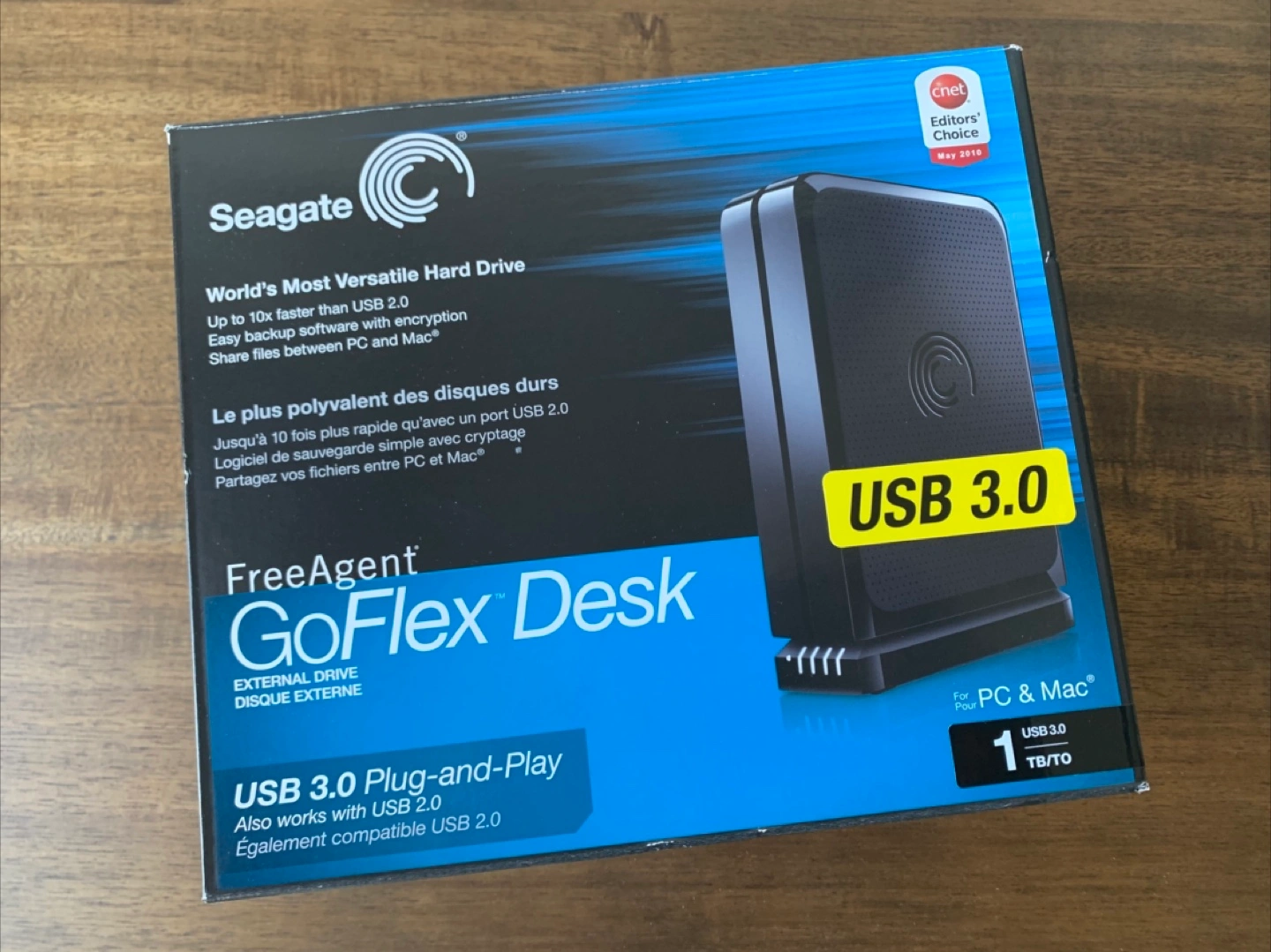Seagate FreeAgent GoFlex Desk external hard drive. 1TB capacity. USB 3.0 plug-and-play, also compatible with USB 2.0. Works with PC and Mac.