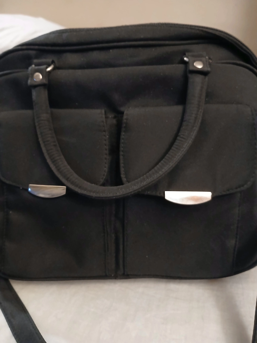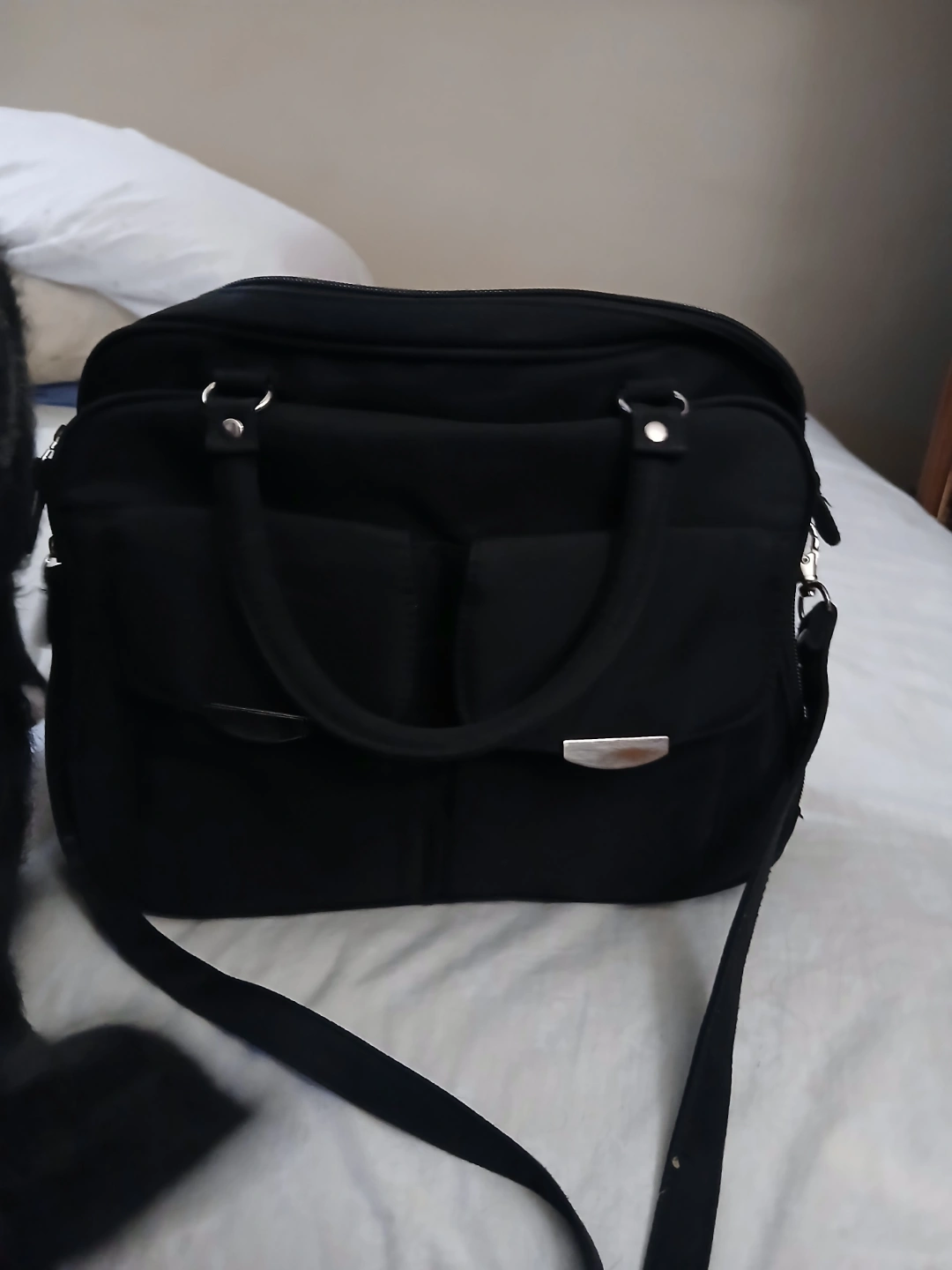 Black handbag. Two main compartments. Several pockets. Top handles and a long shoulder strap. Zippers and silver hardware.