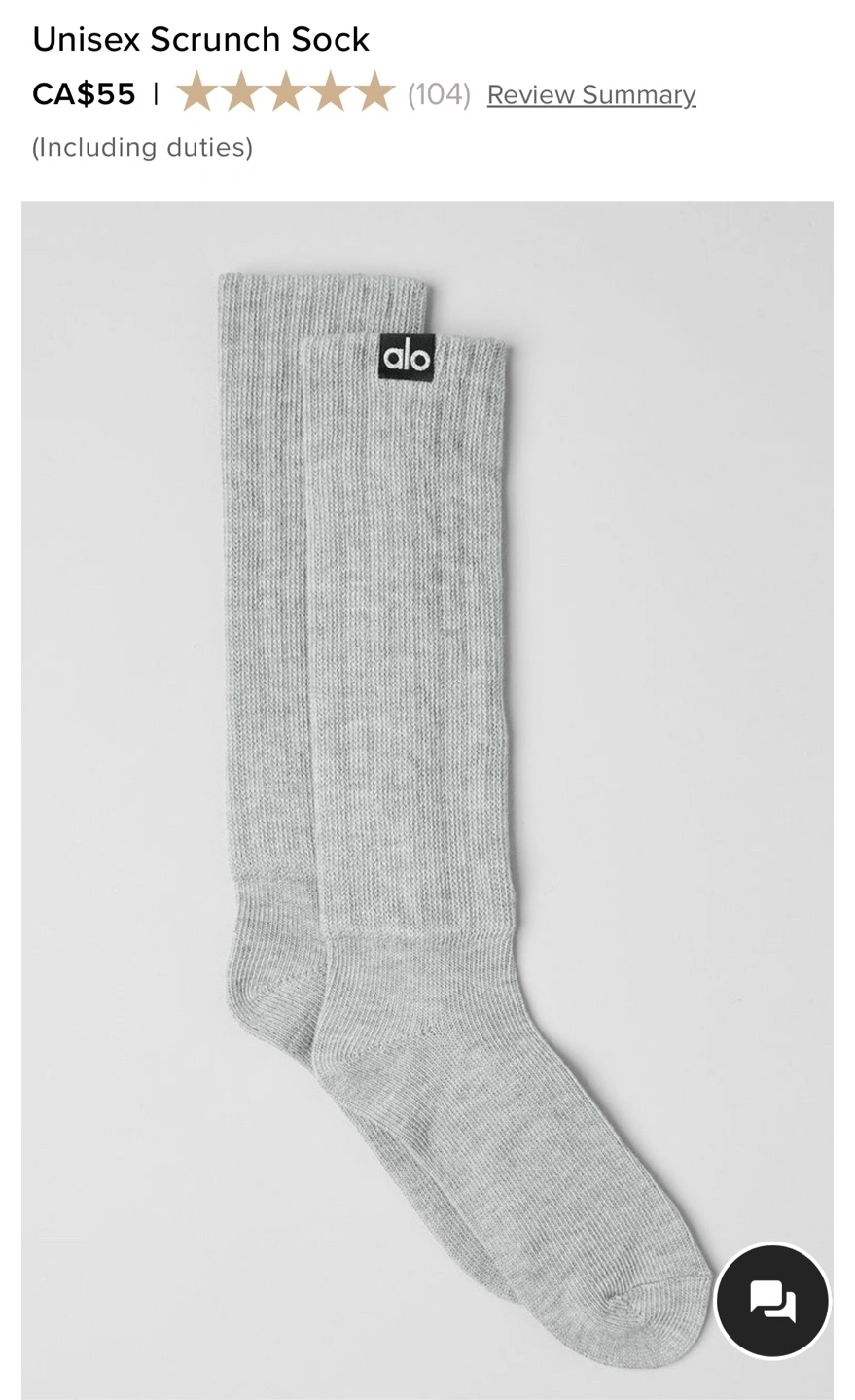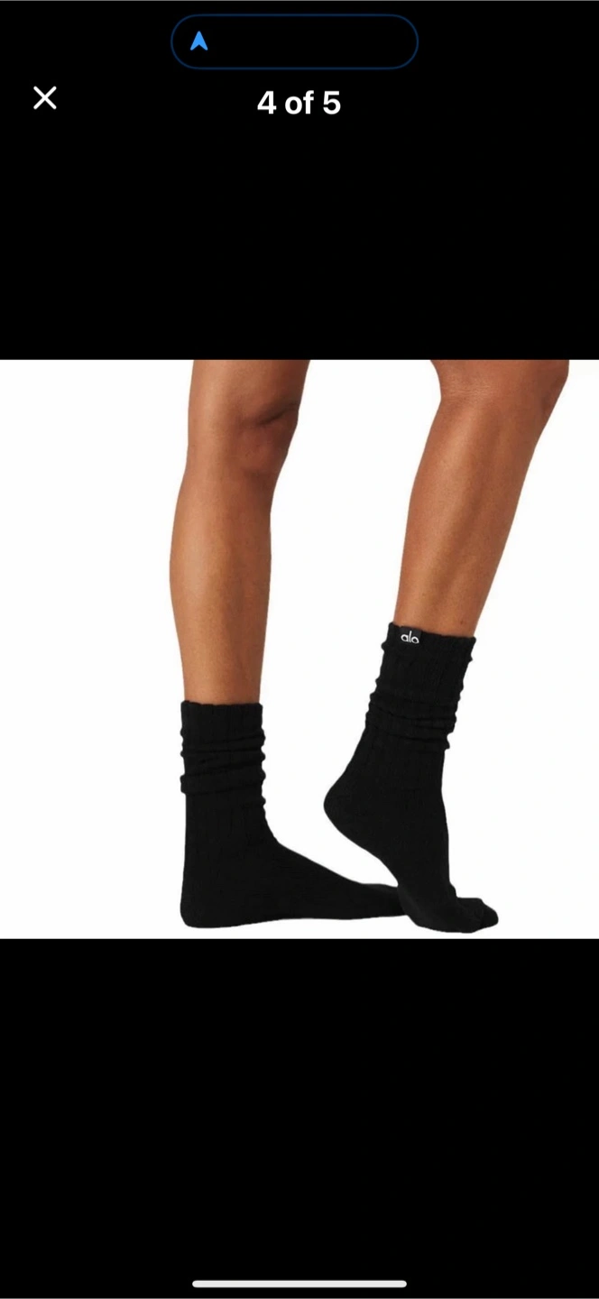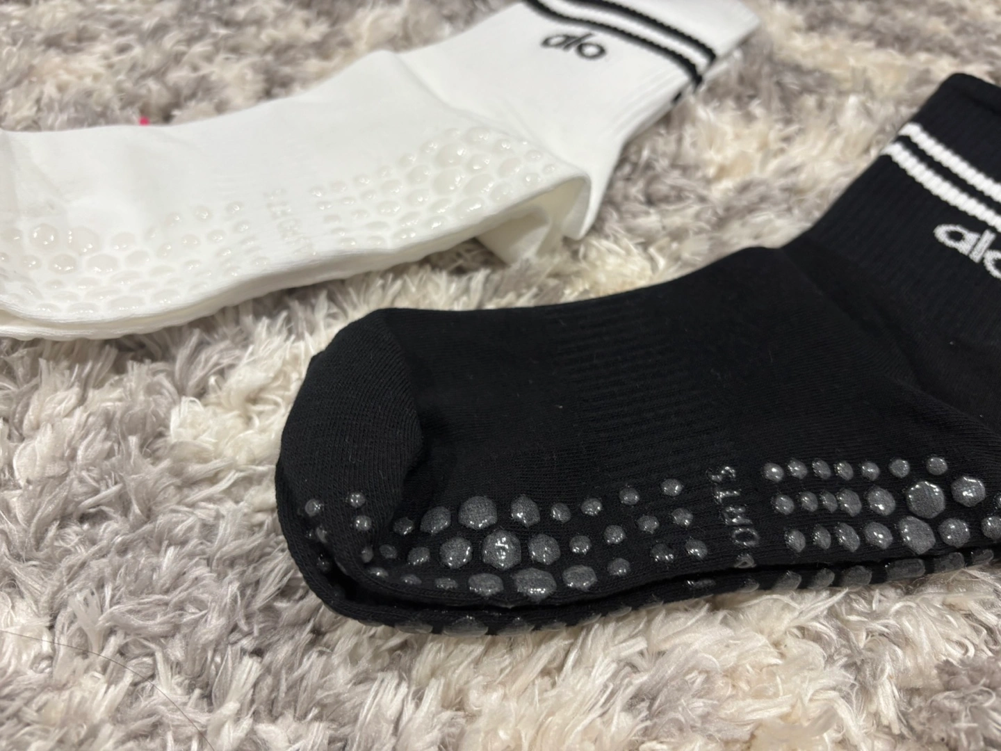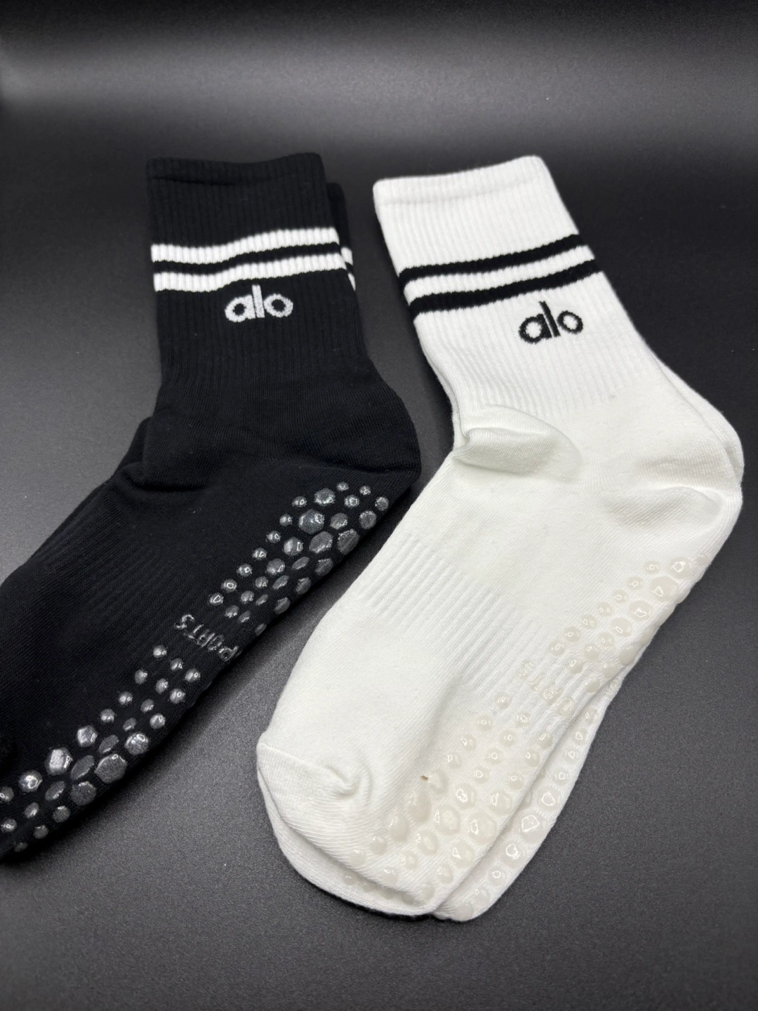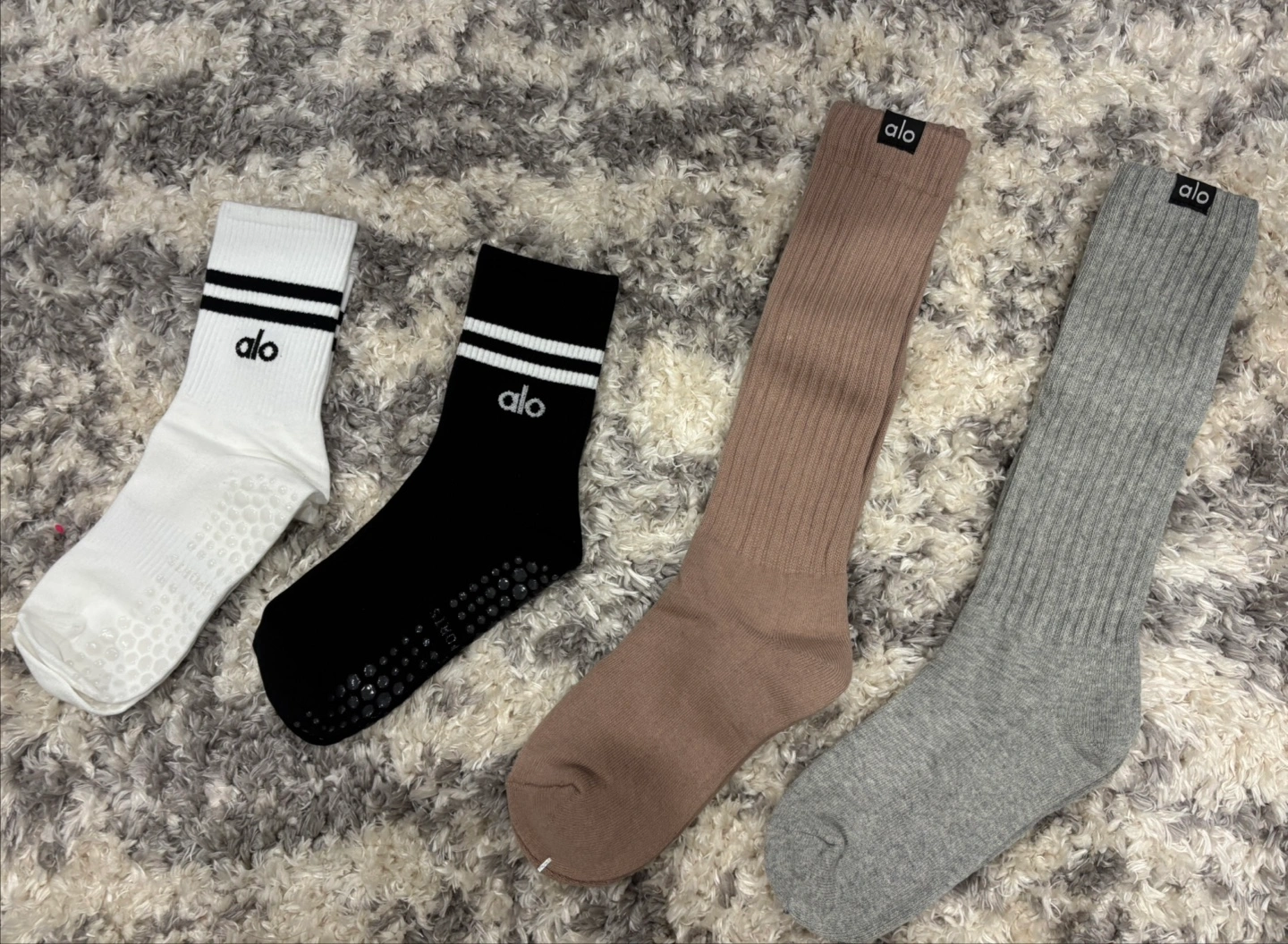 Alo Yoga socks. grippy ankle socks, one white and one black. Two pairs of longer, ribbed socks, one grey and one mauve.
