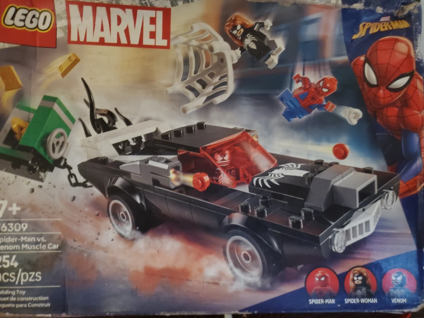 Build Spider-Man's iconic muscle car and recreate epic battles with Venom! This set includes Spider-Man, Spider-Woman, and Venom minifigures. It's a building toy with 254 pieces for creative play. Great for Marvel fans who love action-packed adventures!
