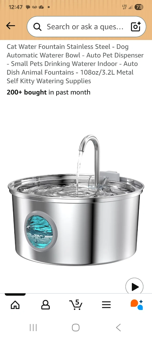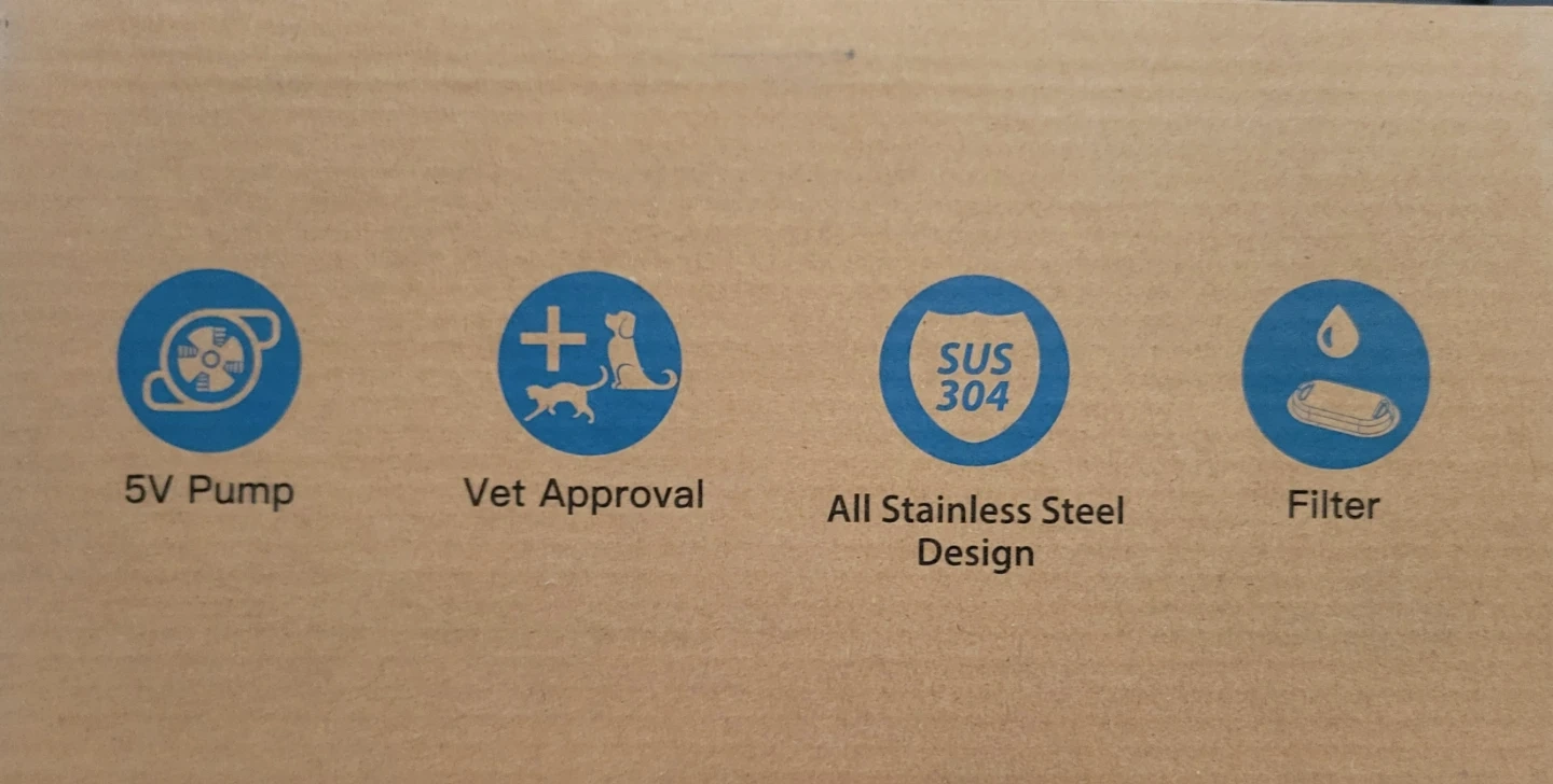Stainless steel pet water fountain with a 3.2L capacity. It features an all stainless steel design and includes several filter refills. The 5V pump ensures quiet operation. It's vet approved and suitable for cats and dogs.