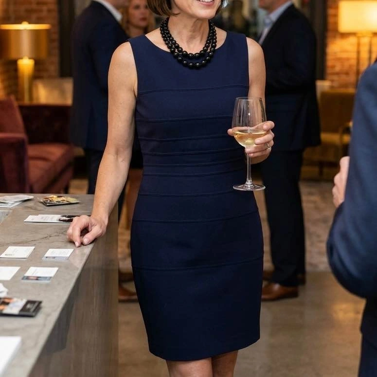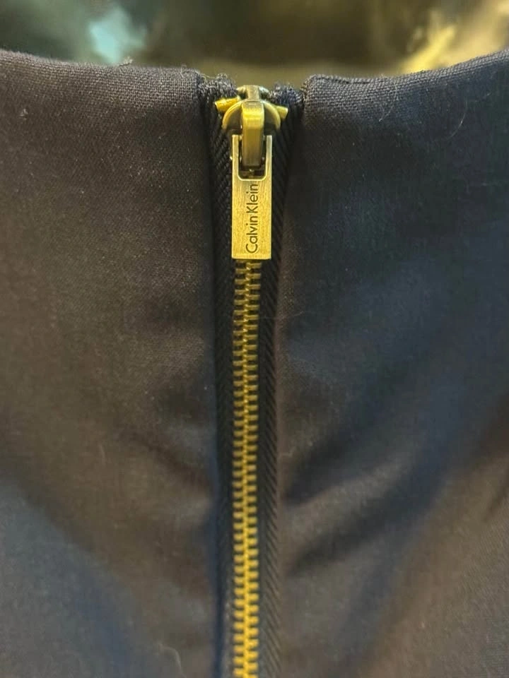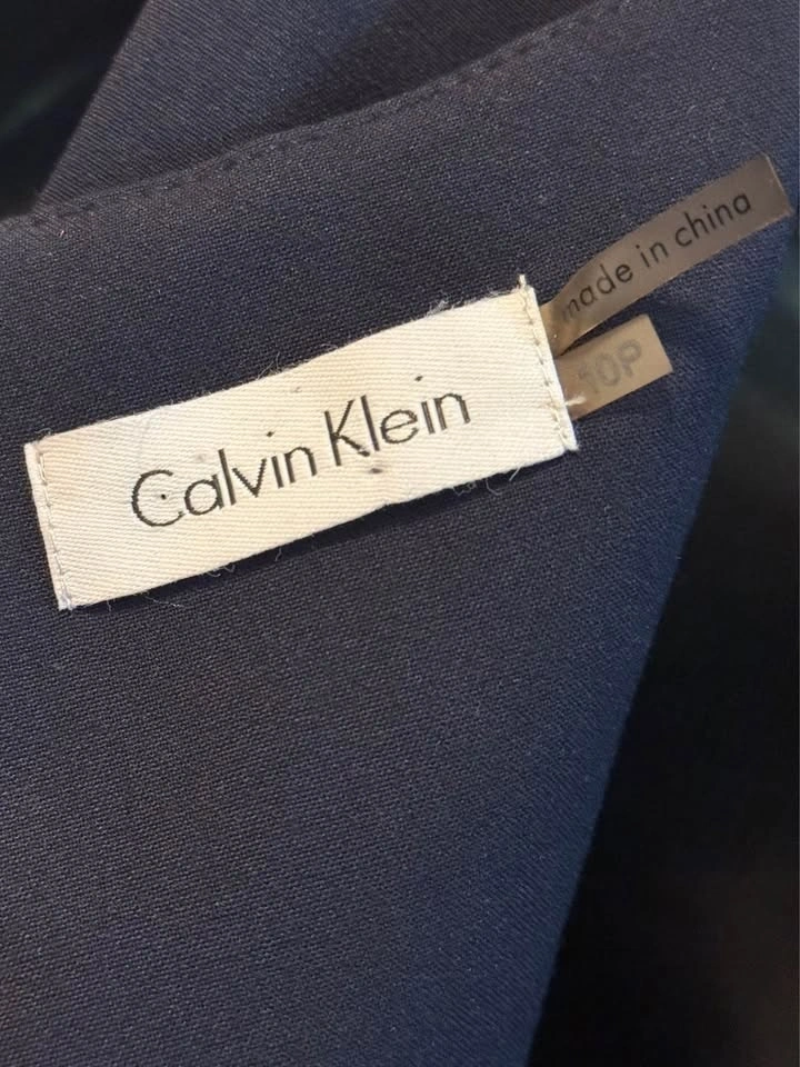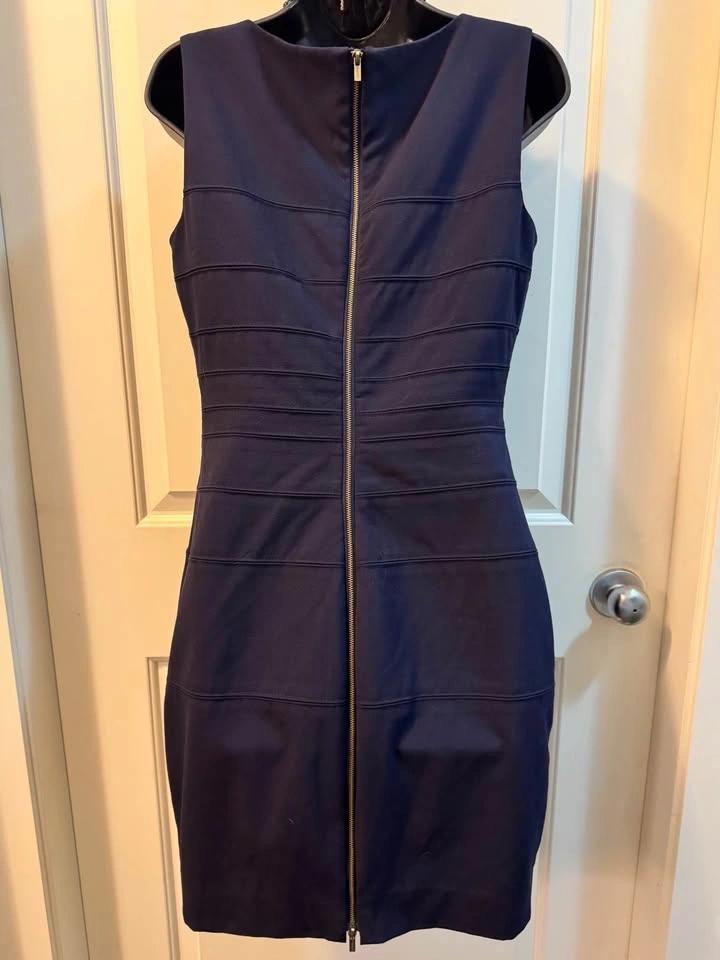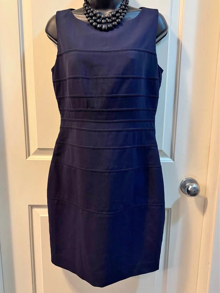 Classic Calvin Klein navy blue sheath dress, size 10P Petite. Perfect for the office, business meetings, or a polished look. Features a sophisticated sleeveless silhouette with unique horizontal seam detailing for texture and a flattering shape. Modest jewel/scoop neckline. Full-length exposed gold-tone back zipper. Tailored sheath silhouette, above knee-length. Mid-weight stretch crepe fabric (wrinkle-resistant). Excellent pre-owned condition, no visible flaws. Only the dress is for sale, accessories not included. Public/door meet up.
